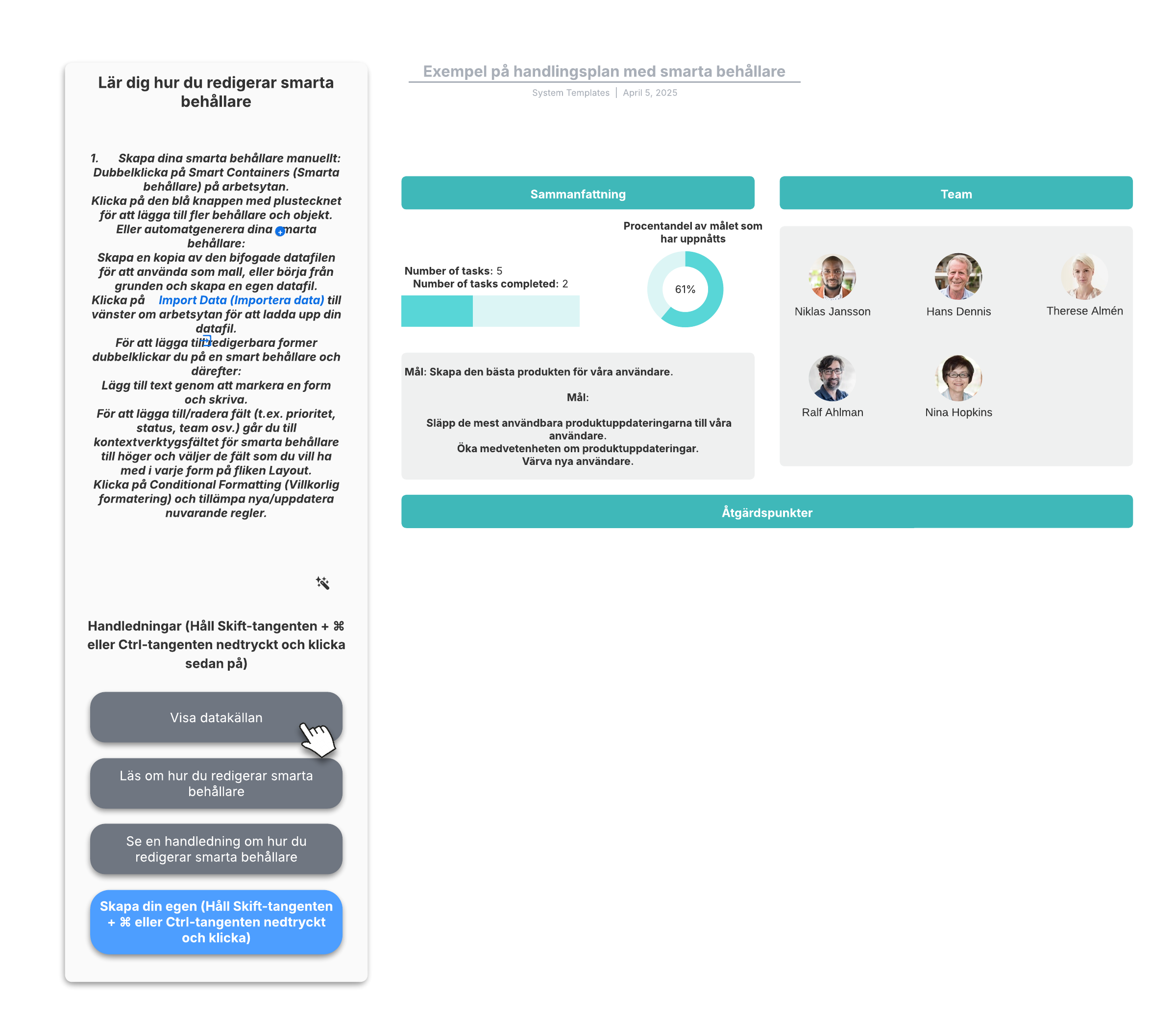 Öppna den här mallen för att se ett detaljerat exempel på en handlingsplan med smarta behållare som du kan anpassa till ditt användningsområde.