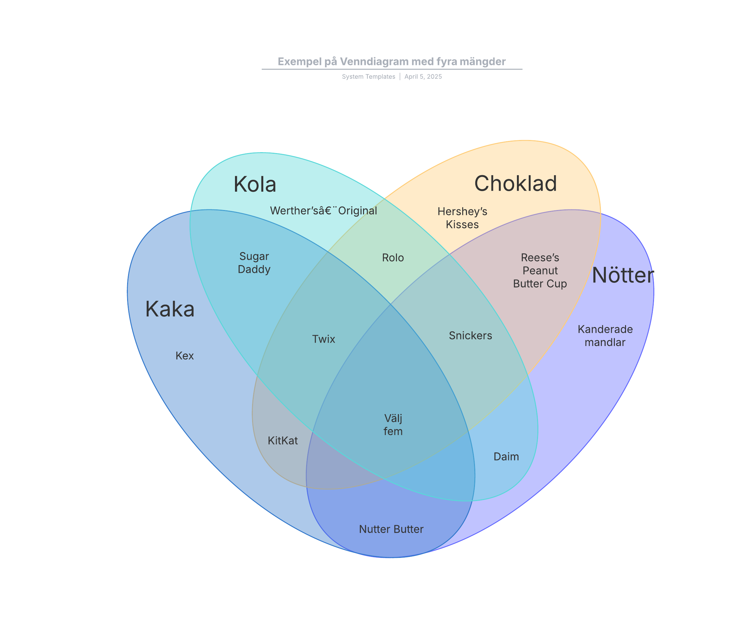 Öppna den här mallen för att visa ett detaljerat exempel på ett Venndiagram med fyra mängder som du kan anpassa till ditt användningsfall.