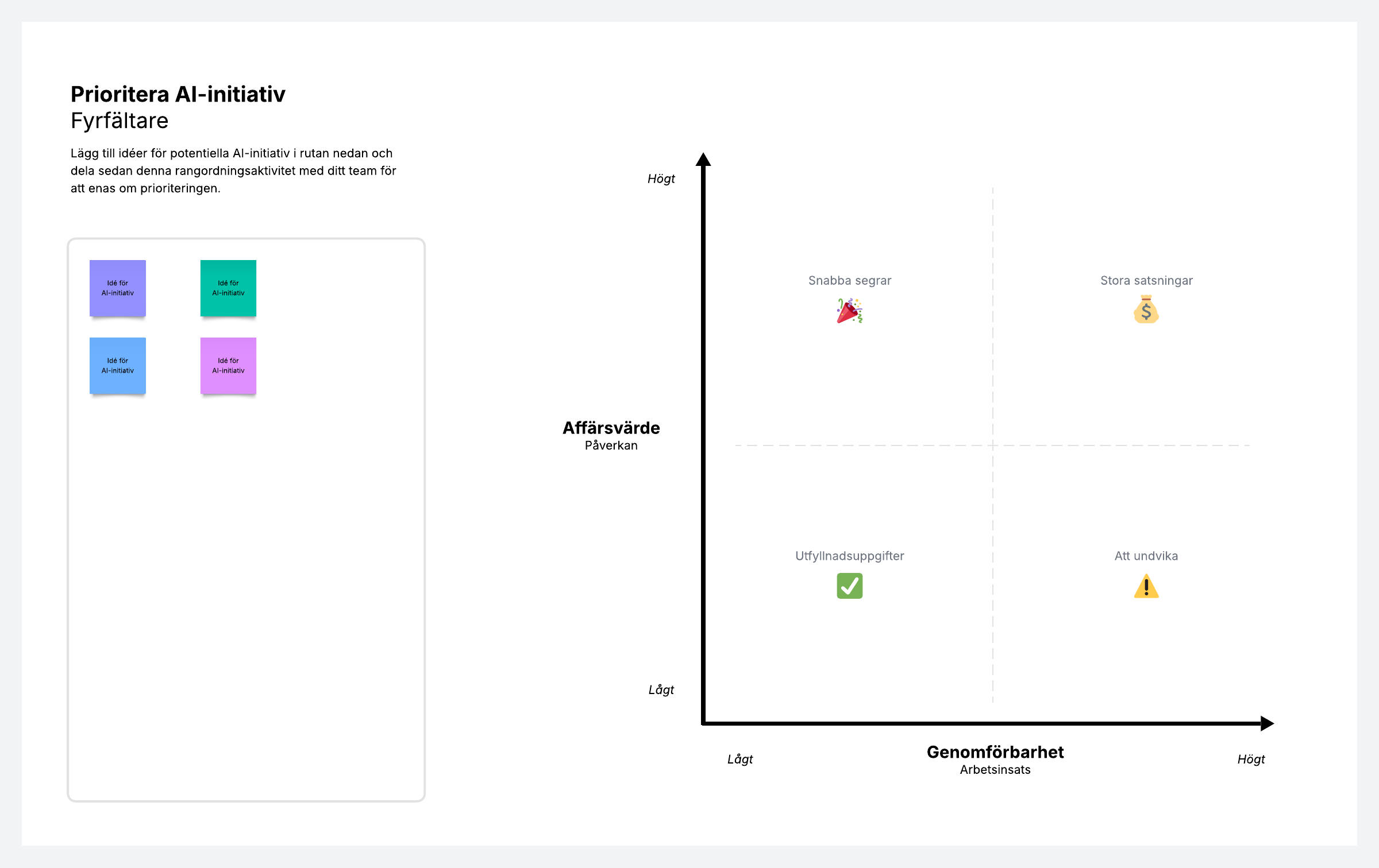 Rangordna idéer för AI-initiativ på en fyrfältare som jämför affärsvärde och genomförbarhet.
