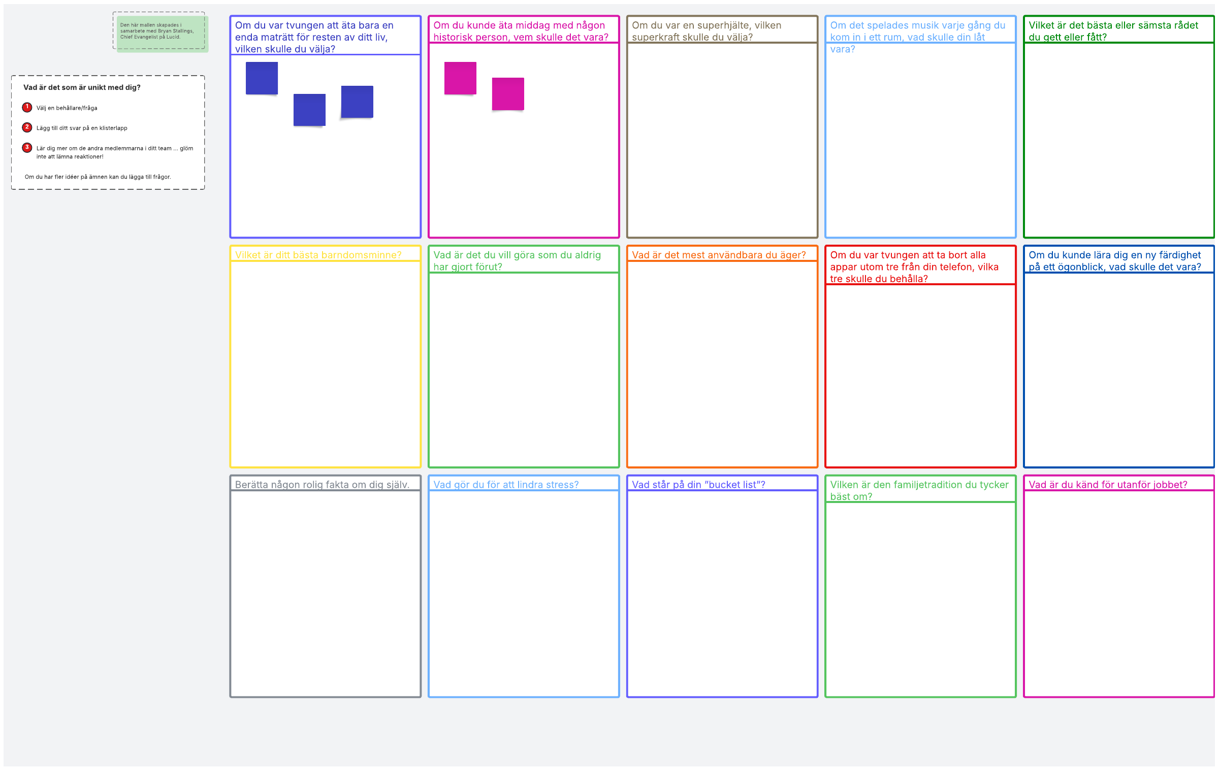 Börja med att öppna mallen och dela Lucidspark-arbetsytan med teammedlemmarna. Allt du behöver göra är att välja en behållare med en fråga och lägga till ditt svar som en klisterlapp.
