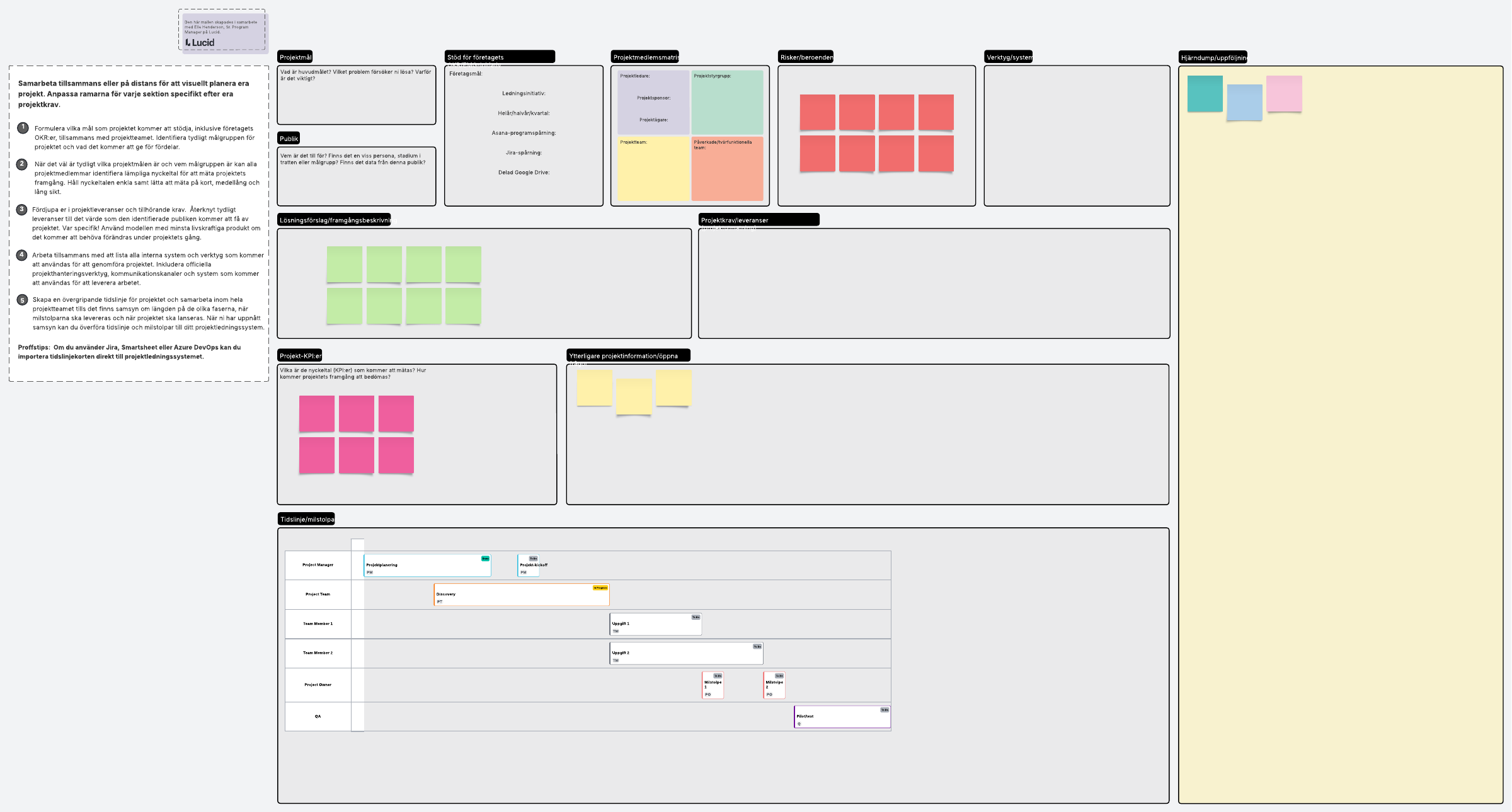 Använd den här arbetsytan för projektplanering för att samarbeta på distans eller i grupp samt för visuell projektplanering. Även om det går att använda mallen som den är, är den enkel att anpassa efter specifika projektbehov.