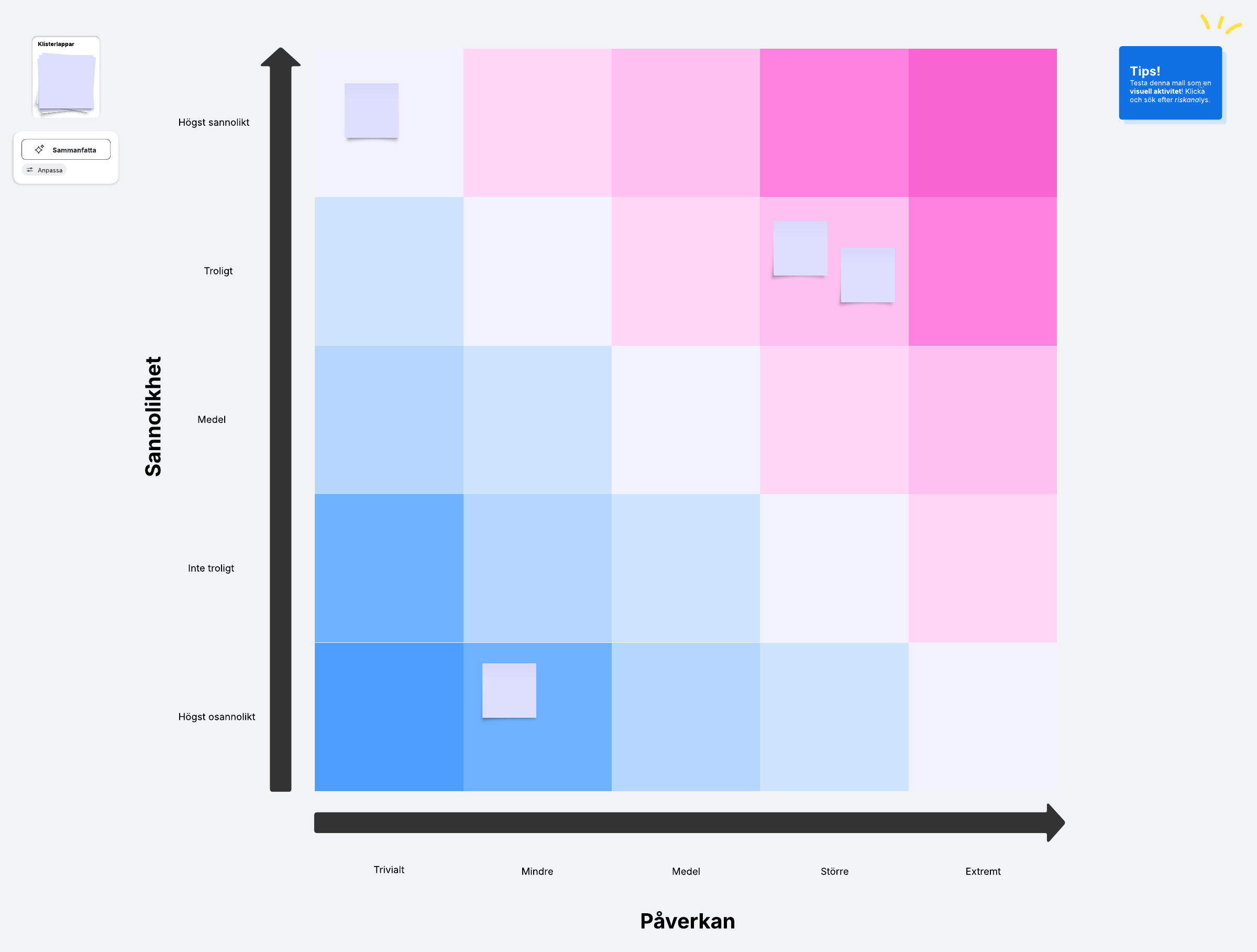 3. Diskutera och sortera klisterlappar i matrisen efter risk. Använd anteckningsfältet för att dokumentera intressanta diskussionspunkter.