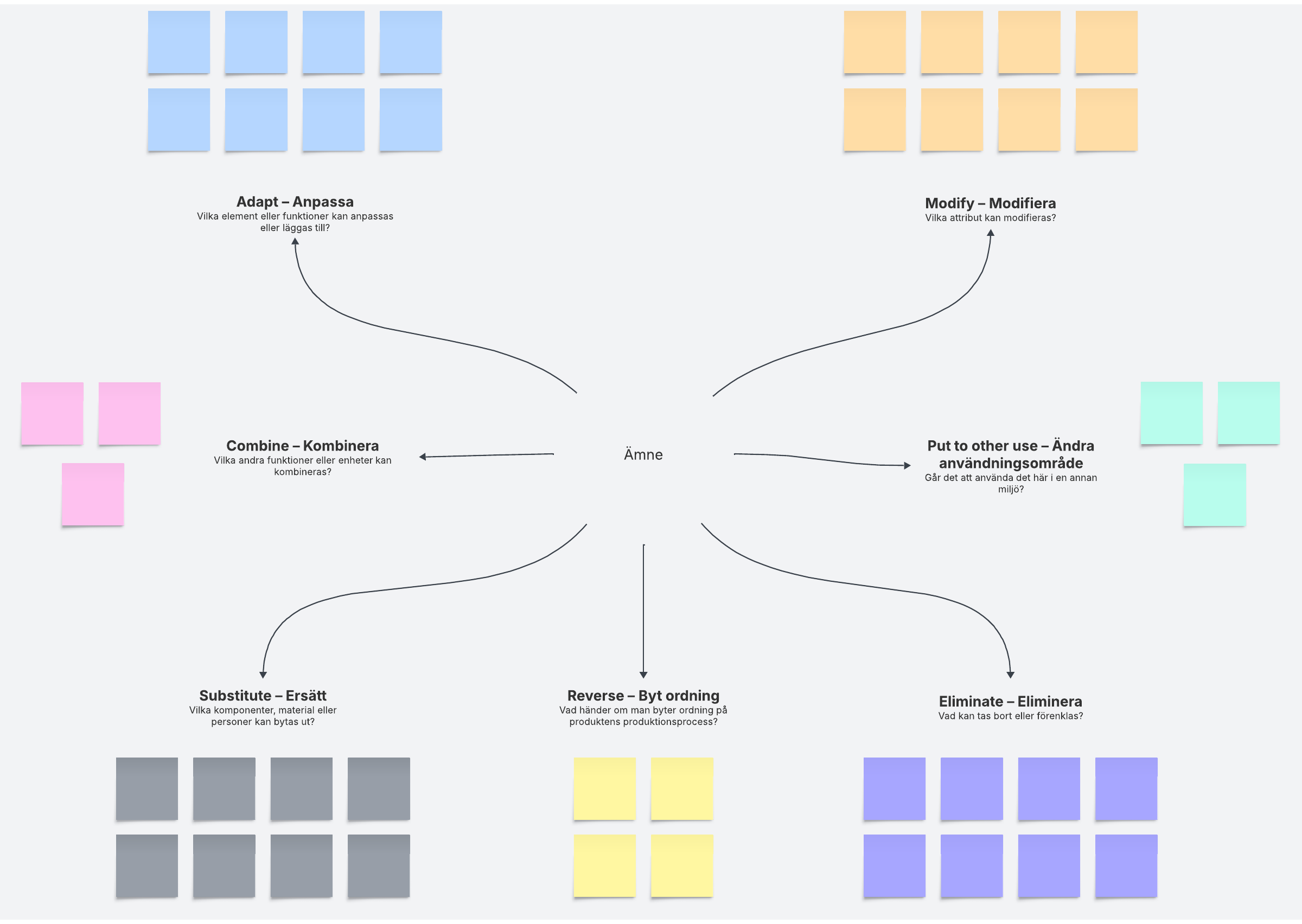 Brainstorma idéer med SCAMPER-ramverket. SCAMPER står för sju åtgärder: Substitute (ersätt), Combine (kombinera), Adapt (anpassa), Modify (modifiera), Put to other use (ändra användningsområde), Eliminate (eliminera) och Reverse (byt ordning). Samarbeta om att besvara frågor baserade på dessa åtgärder för att hitta innovativa problemlösningar.
