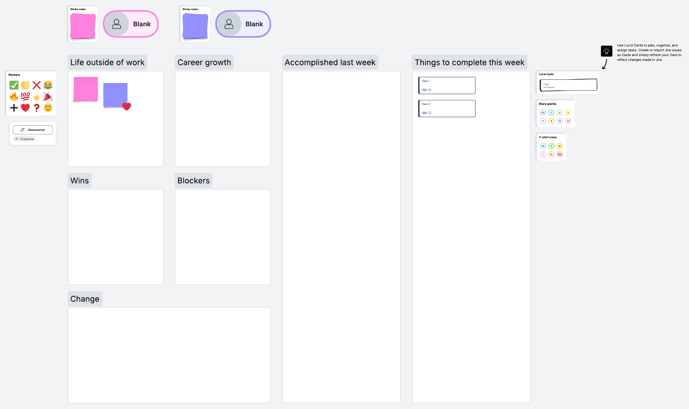Then, you can add your own color-coded sticky notes to each section and use both sets of contributions to guide your discussion during your scheduled one-on-one meeting. If you choose, you and your employee can also use emoji reactions or comments to indicate which items you would most like to discuss.