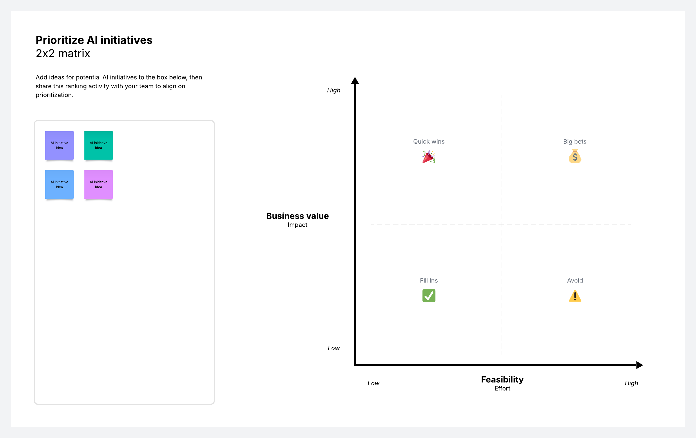 Rank ideas for AI initiatives on a 2x2 matrix comparing business value and feasibility.