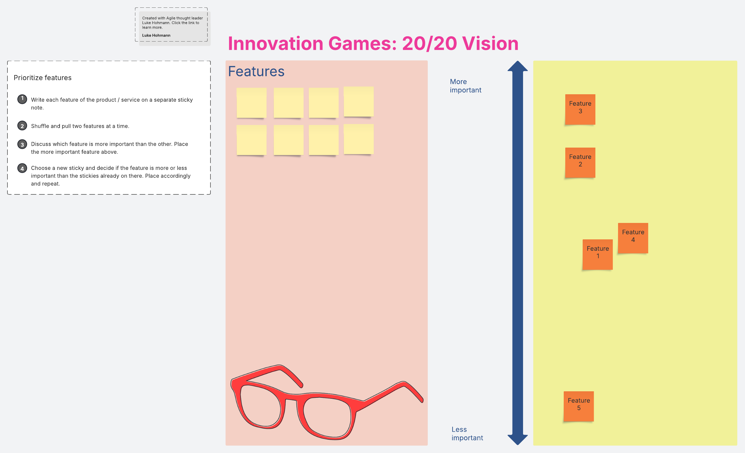 Prioritize the features of your product with this 20/20 vision template from Innovation Games.