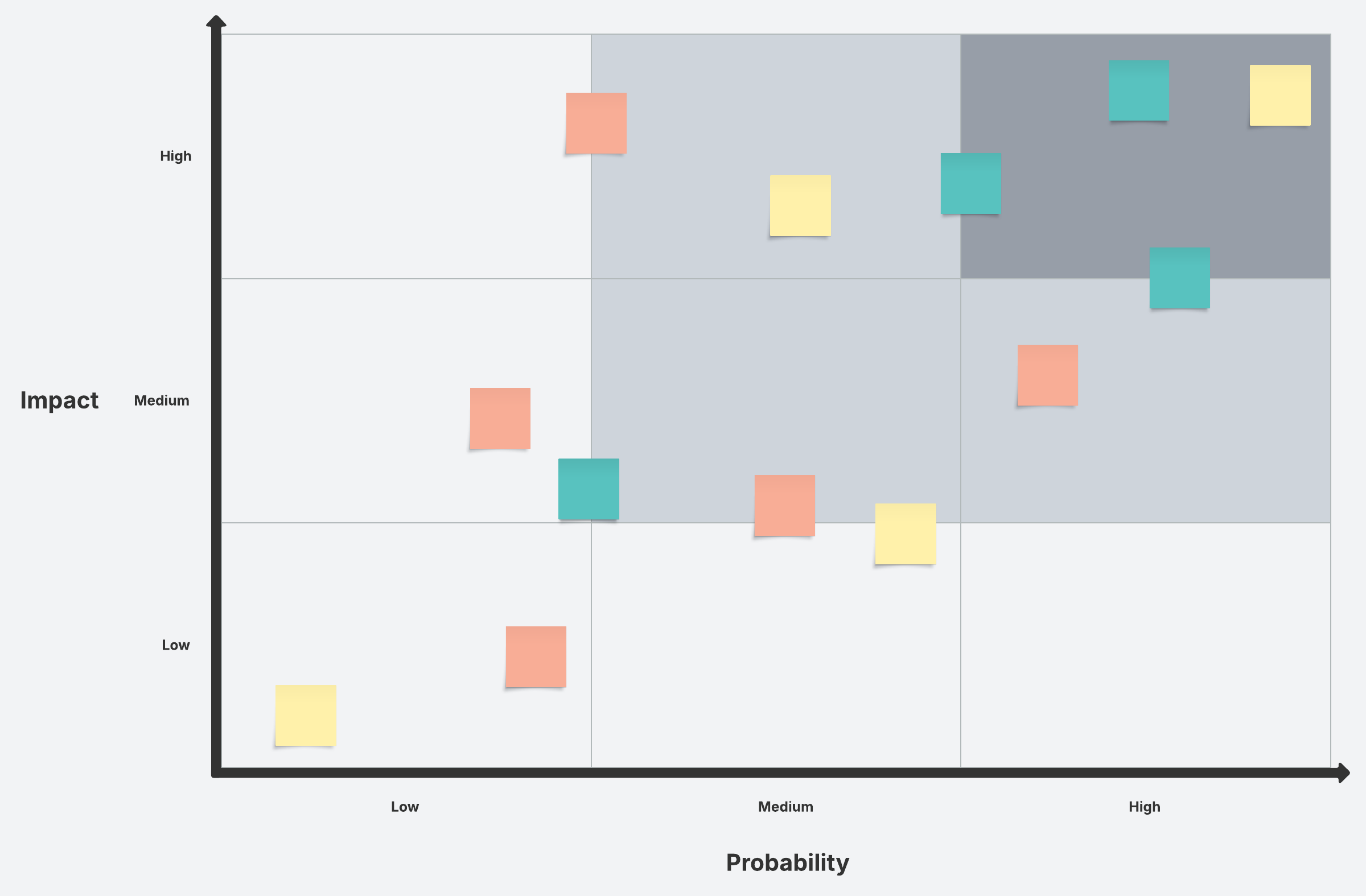 Lucidspark’s 3x3 template uses the probability and impact axises to evaluate risk, but these can be easily swapped out to compare other factors such as impact and effort if you’re trying to prioritize new opportunities.