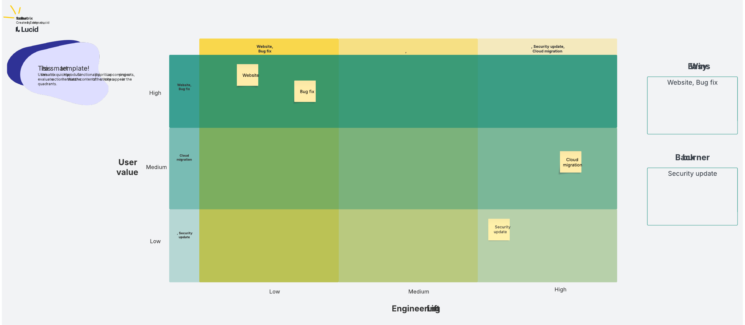 Use this smart template to map product functionality, prioritize upcoming projects, or evaluate action items. You can also customize it for your own use case.