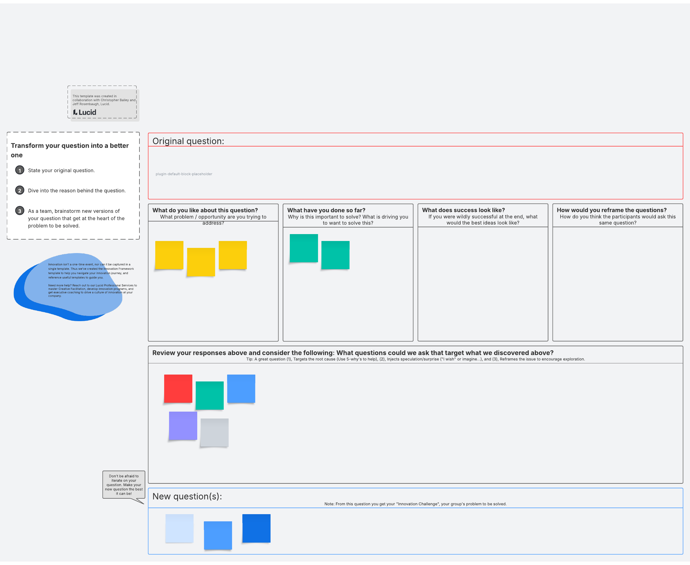Transform your original questions into better questions that you can take action on with the “a better question” template. To use it, share it to your Lucidspark whiteboard and then:
