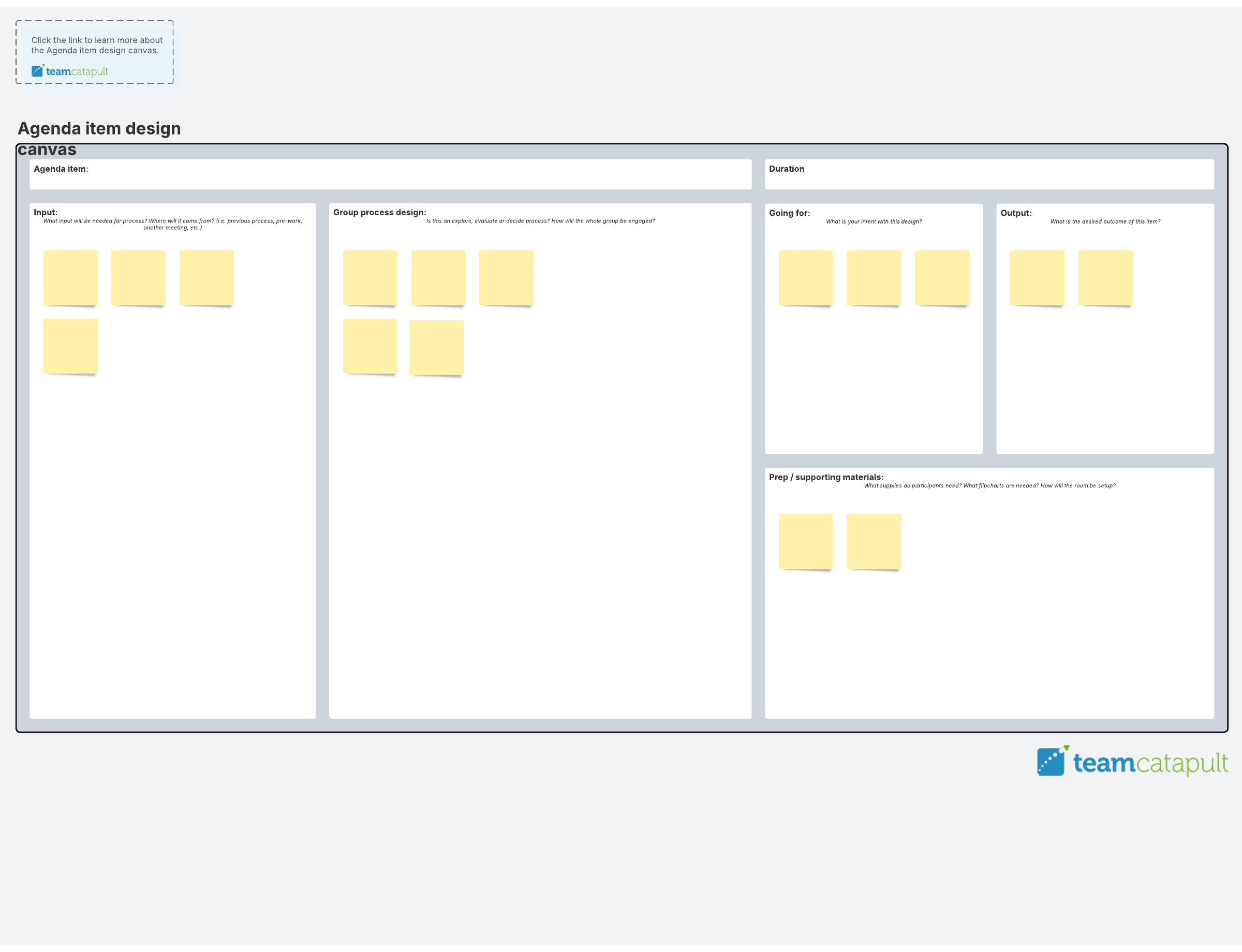 Try out this agenda item design canvas, created in collaboration with team coach and leadership expert Marsha Acker at TeamCatapult. Start exploring the details of the group process design.