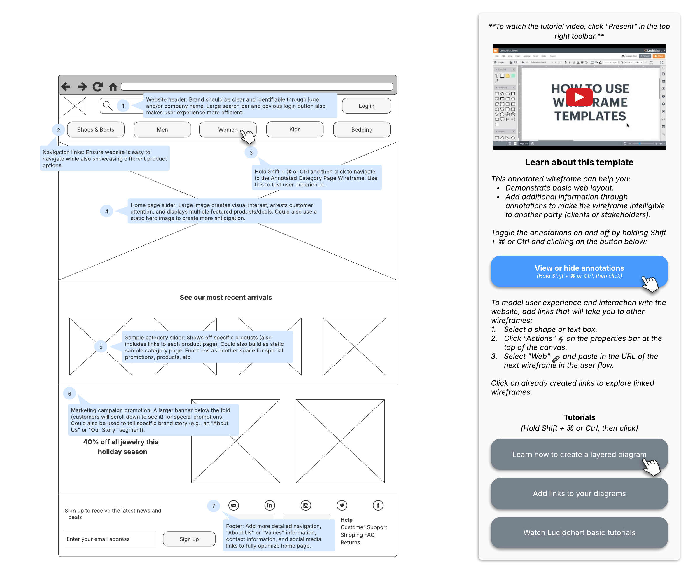 Open this template to view a detailed example of an annotated e-commerce home page wireframe that you can customize to your use case.