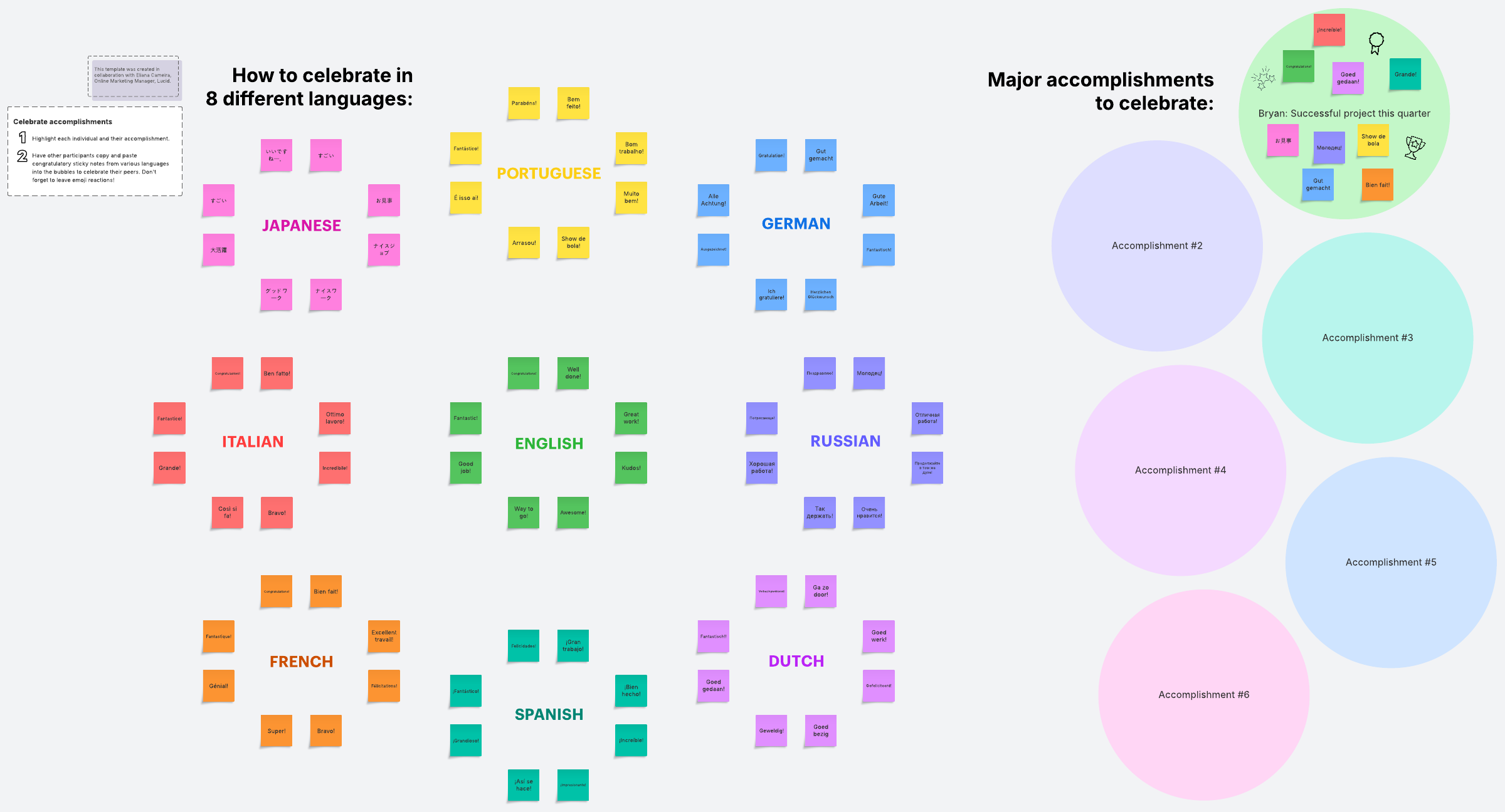 During the meeting, go through each accomplishment in turn: as you do so, participants can celebrate their teammates by either dragging or copying the sticky notes with congratulatory messages in different languages into the circle. You can also write your own message on a sticky note.