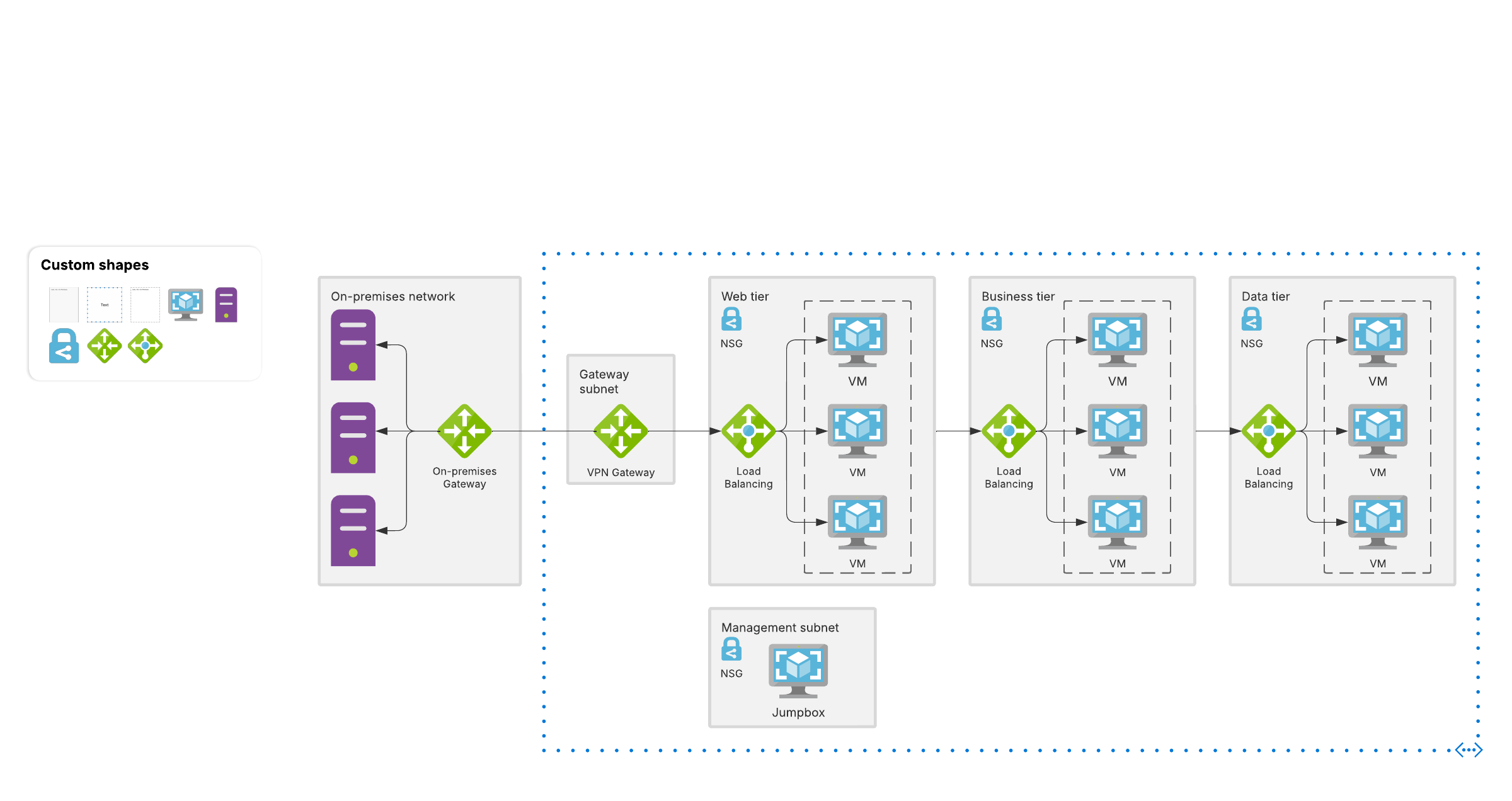 Open this template to view an Azure hybrid cloud via VPN reference architecture that you can customize to your use case