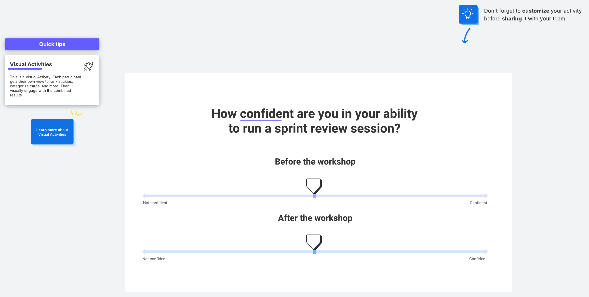 Keep track of your team's confidence levels before and after a workshop to measure how effective it was and spark conversations about why and what to do next time.