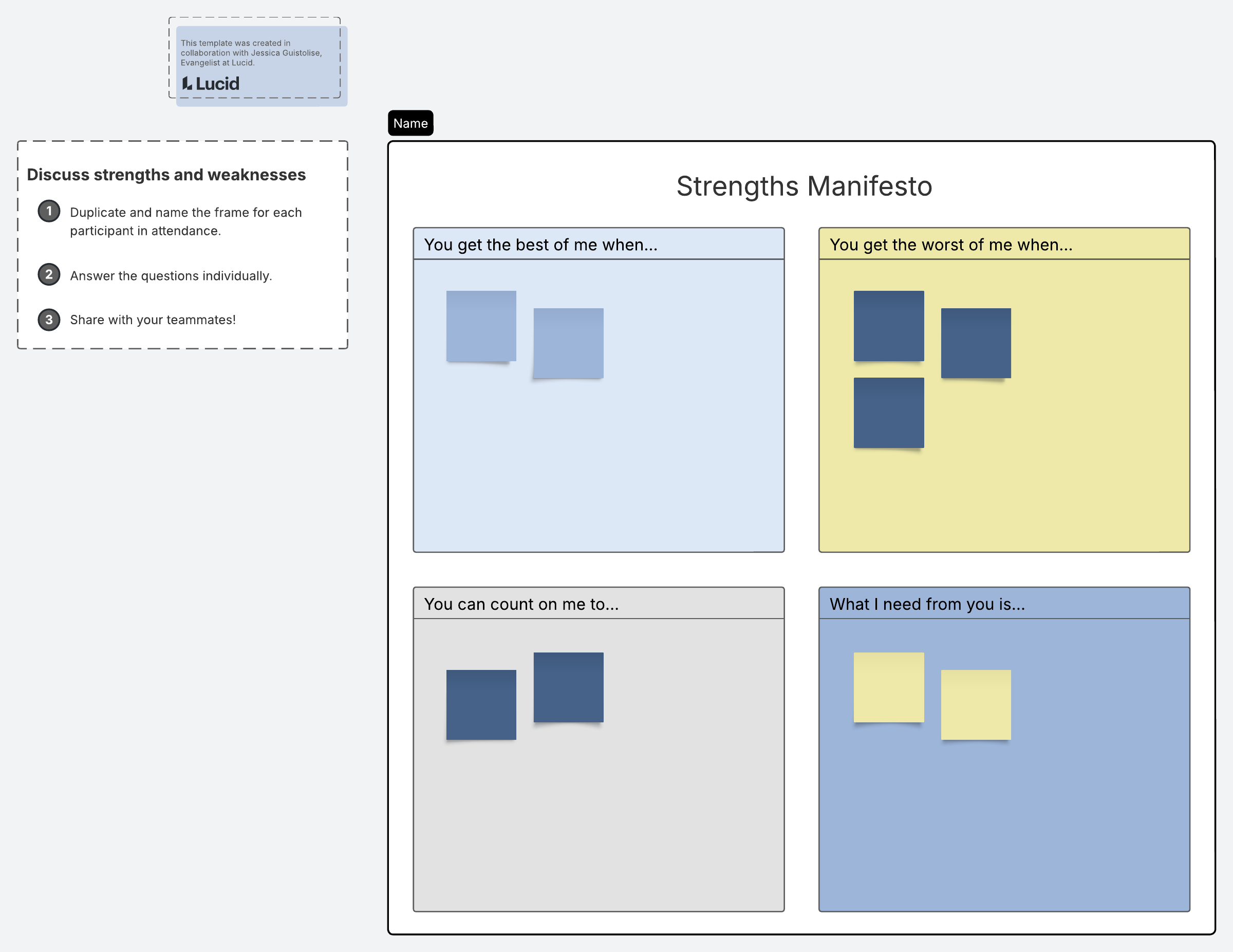 - Share the template to your Lucidspark whiteboard and duplicate it for each team member, adding their individual names at the top.