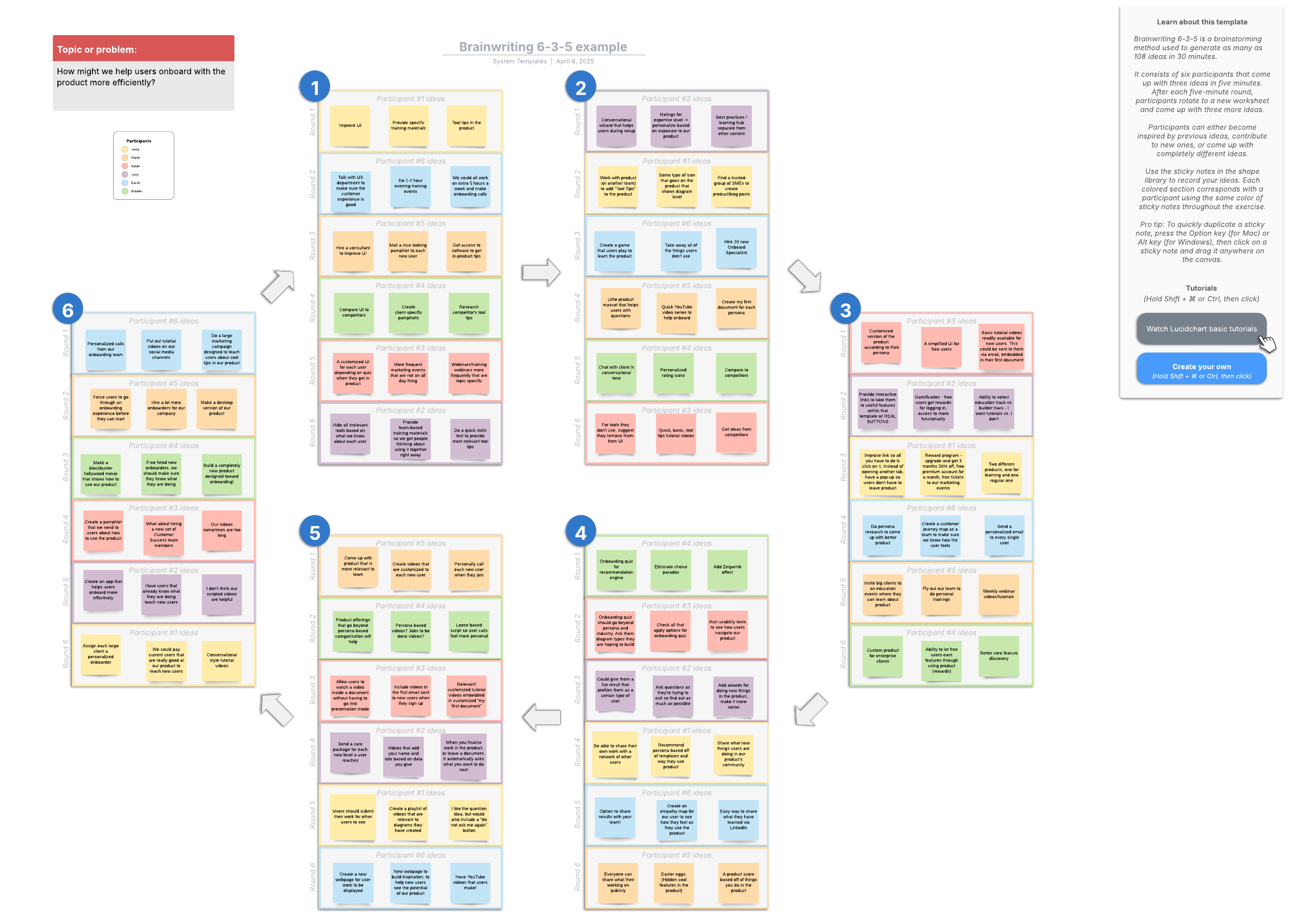 Open this template to view a detailed example of brainwriting 6-3-5 that you can customize to your use case.
