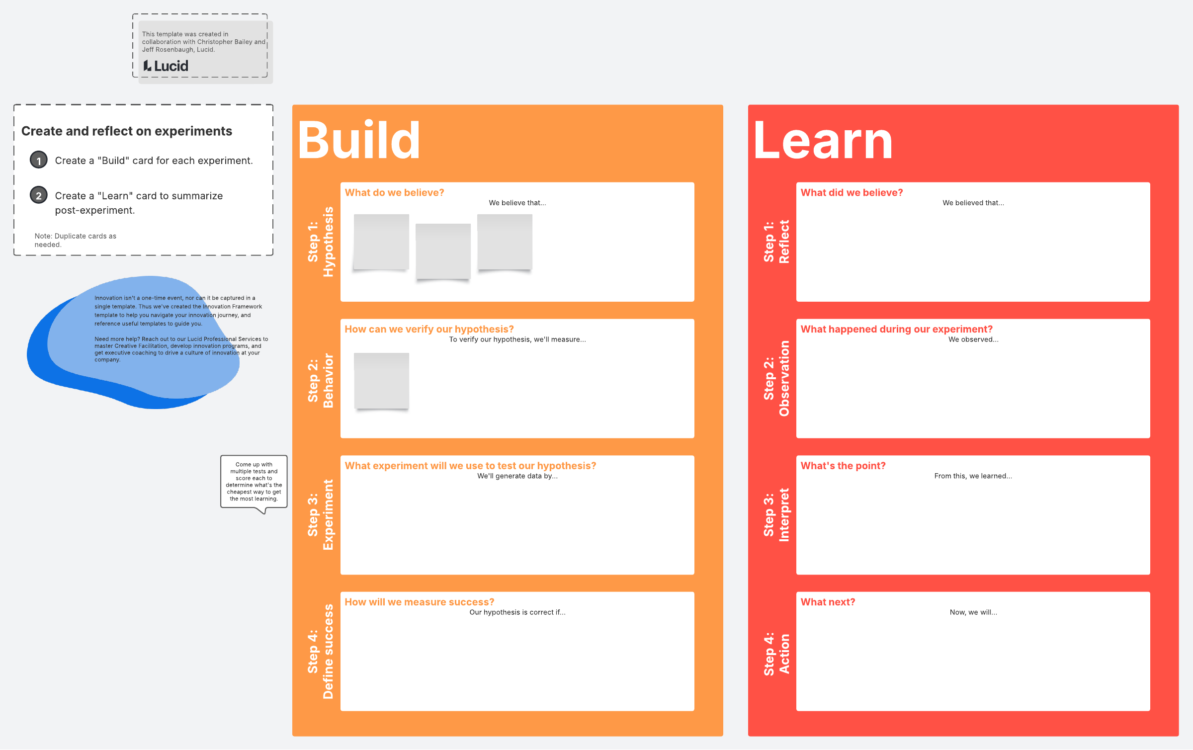 Lucidspark offers a simple and intuitive template that you can easily share with other team members and any relevant stakeholders. To use this template, simply add it to your Lucidspark whiteboard. Then start by using sticky notes to create a “build” card for each experiment you plan to test. Progress through steps 1–4 in order.
