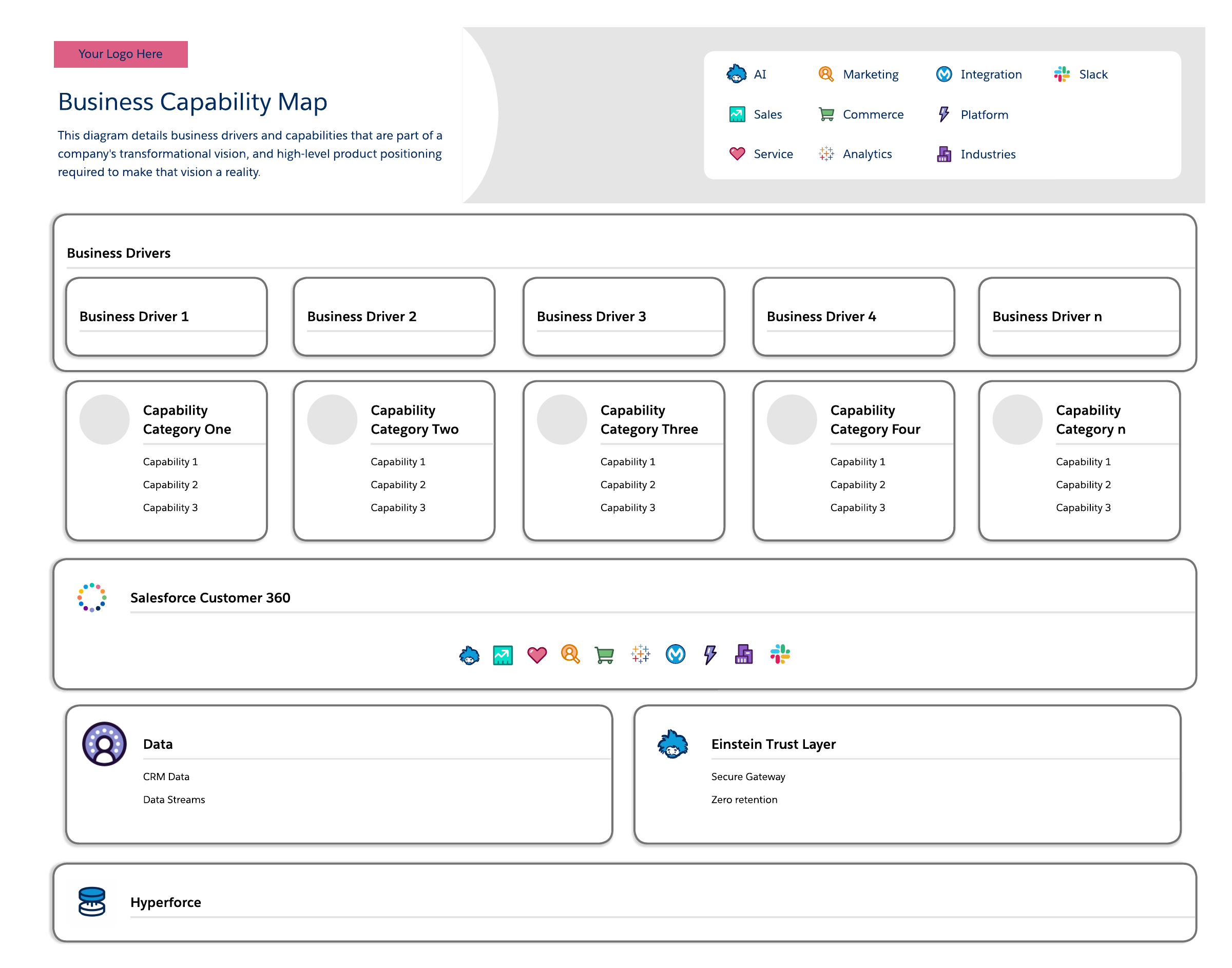 Open this template and add content to customize this Salesforce business capability map to your use case.