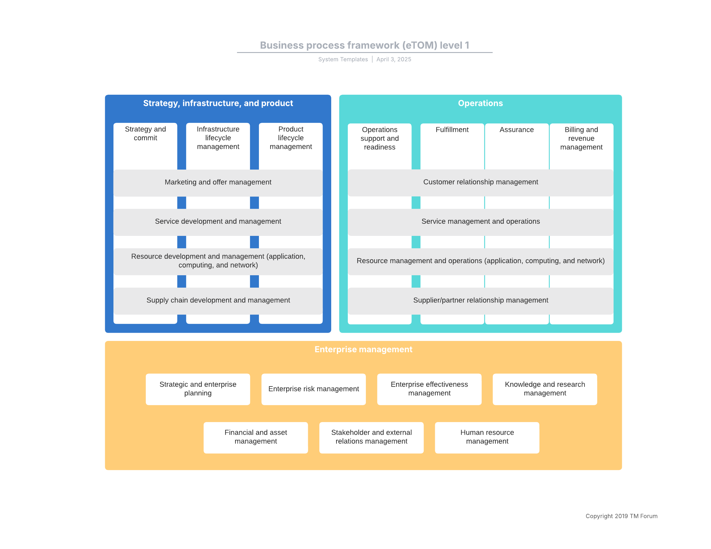 Open this template to view a detailed example of a level 1 business process framework (eTOM) that you can customize to your use case.
