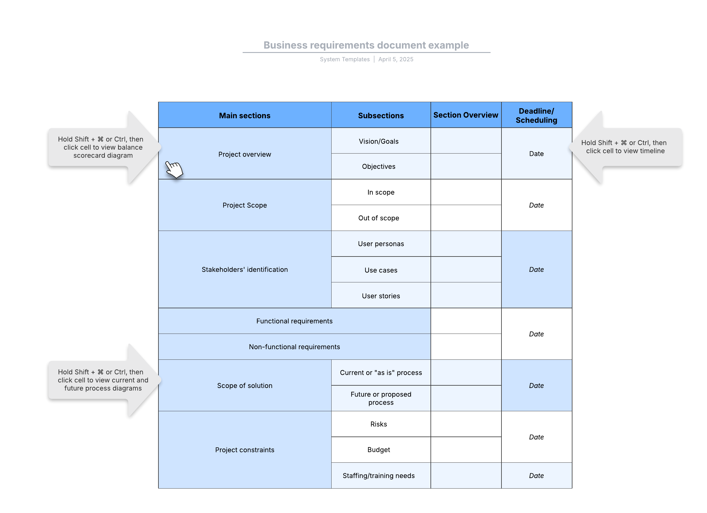 Open this template to view a detailed example of a business requirements document template that you can customize to your use case.