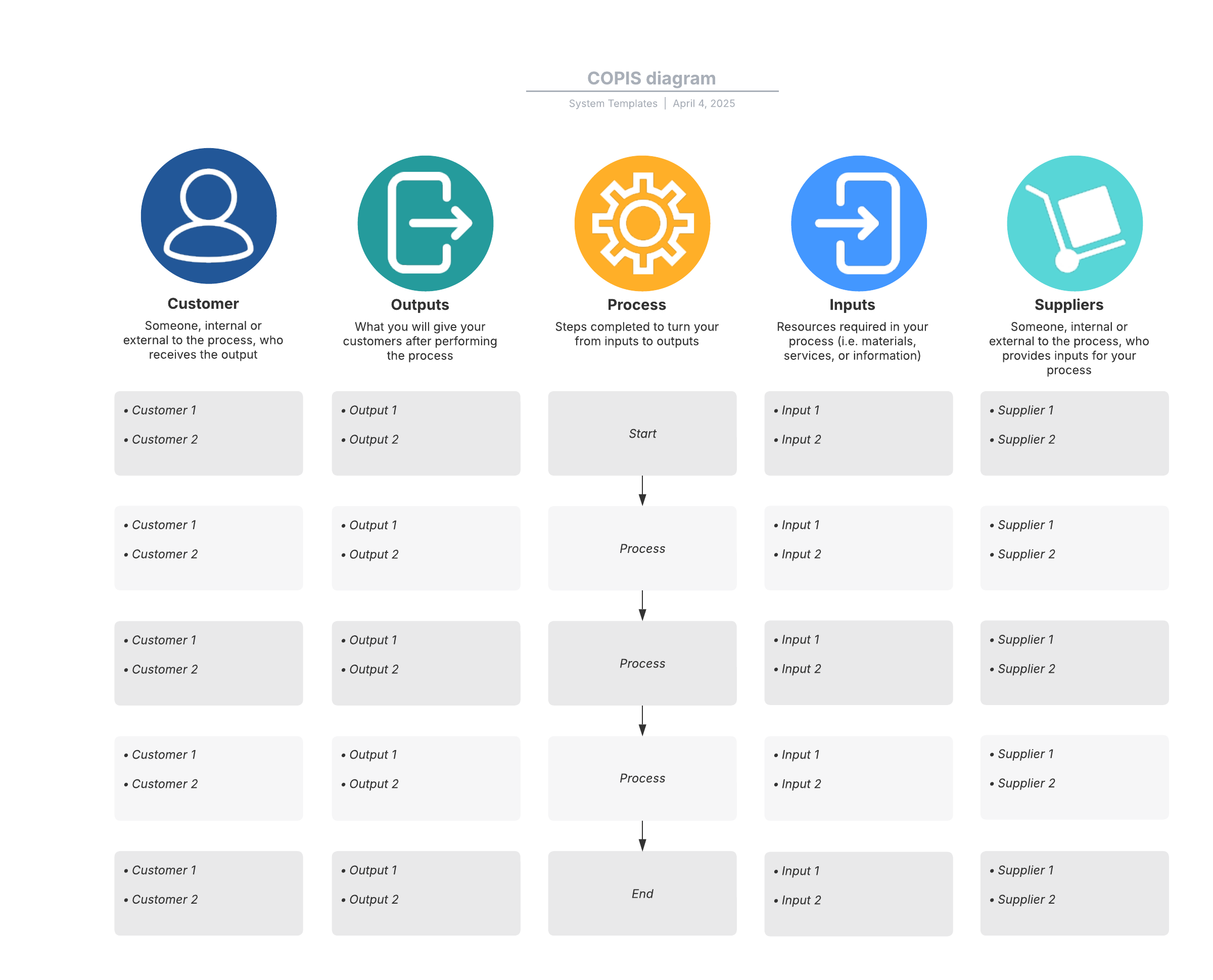 This detailed COPIS (customers, outputs, process, inputs, suppliers) template can help you: