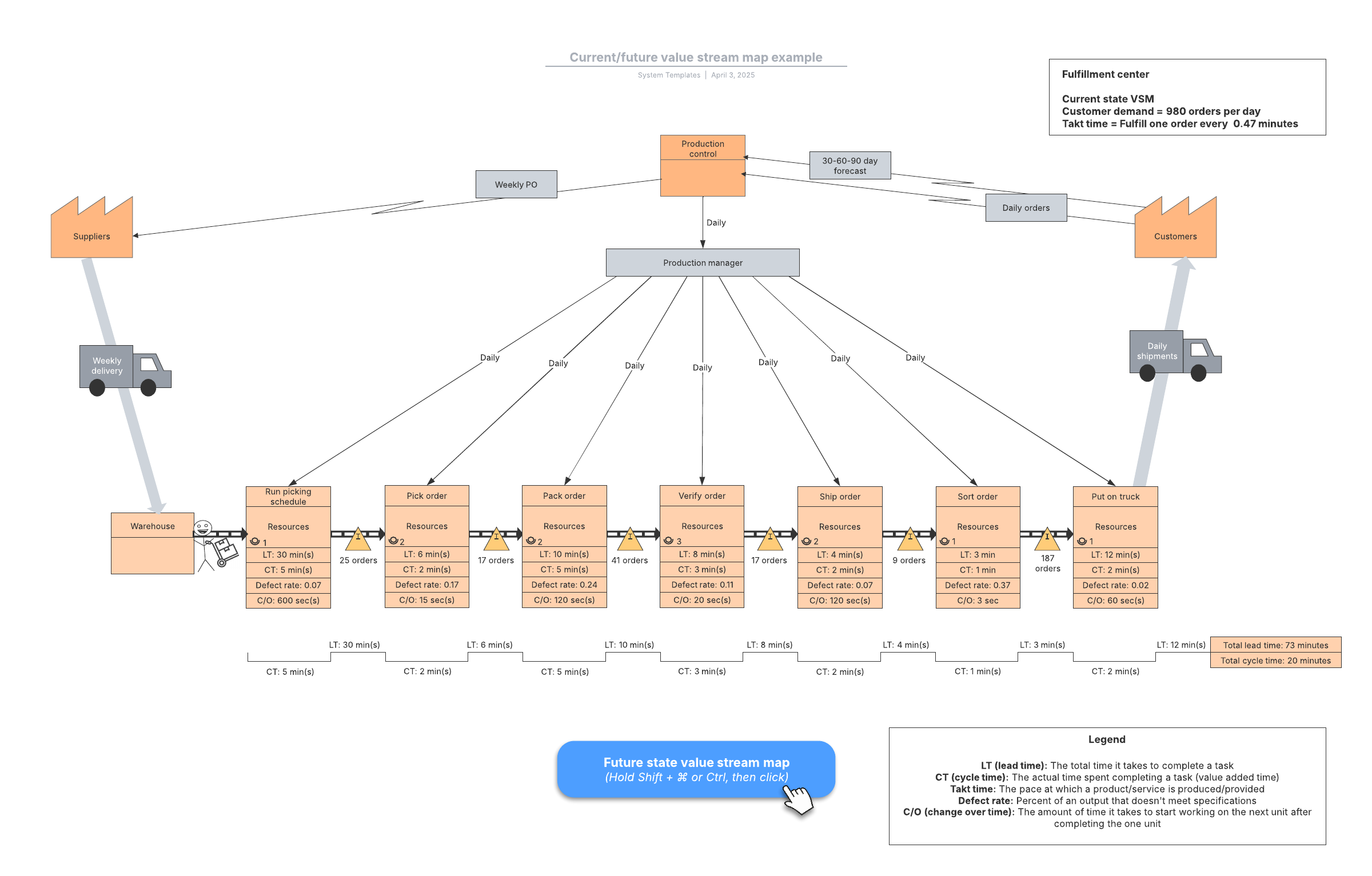 Open this template to view a detailed example of a value stream map (push system) that you can customize to your use case.