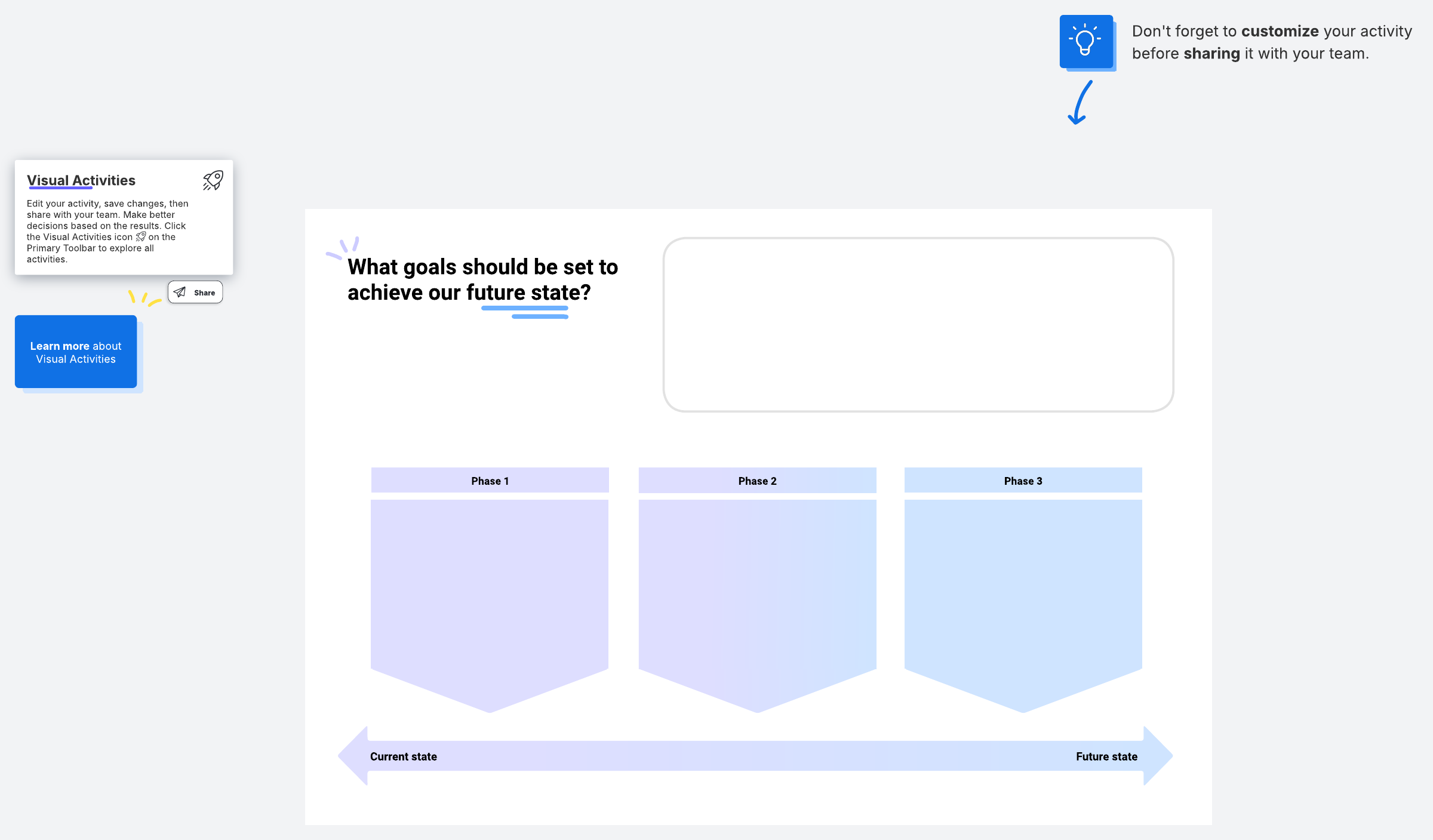 Organize your goals across phases which will take you from your current state to your desired future state. This activity can help you develop a strategy, roadmap, or plan by knowing what to focus on now and in the future.