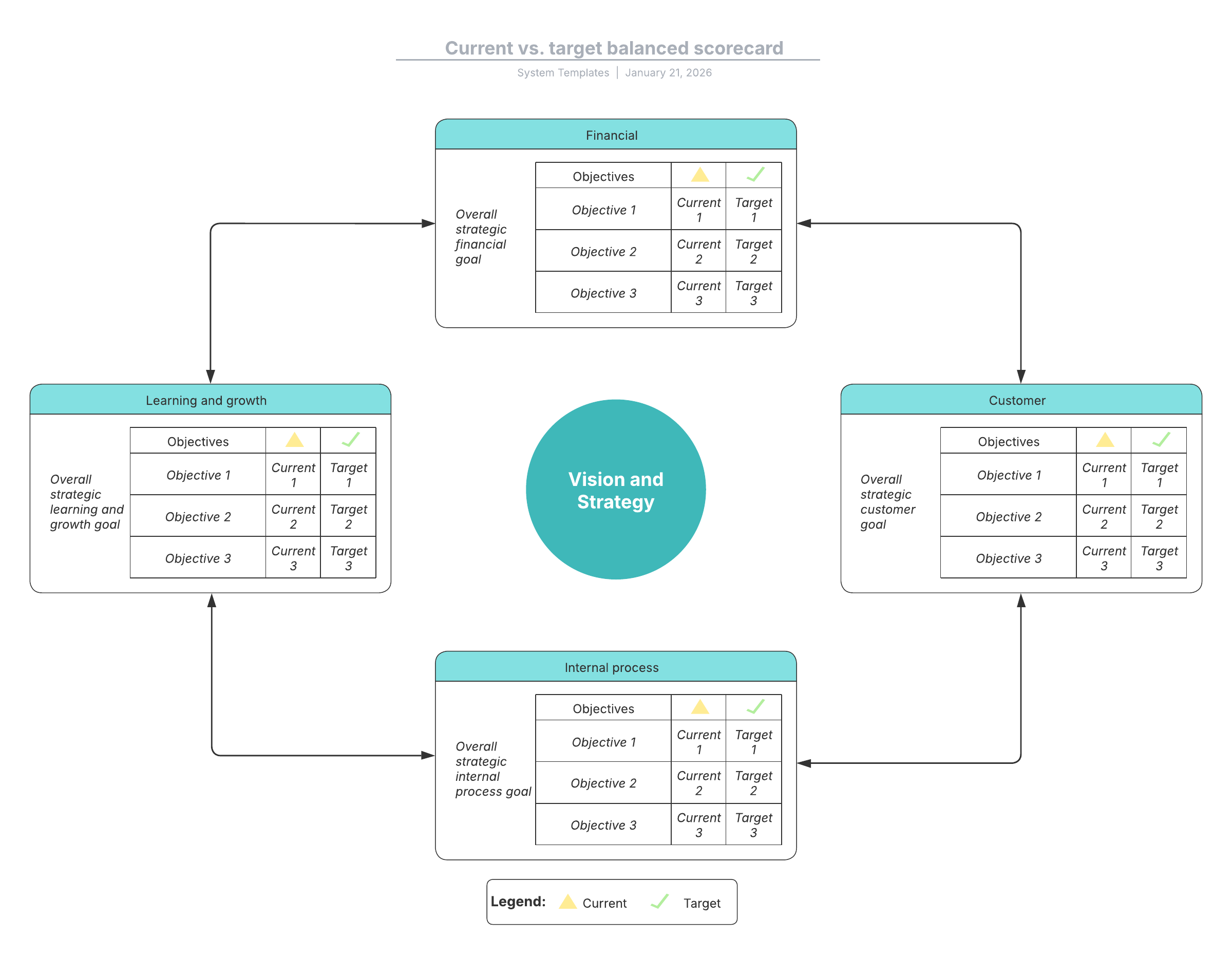 Open this template and add content to customize this current vs. target balanced scorecard to your use case.