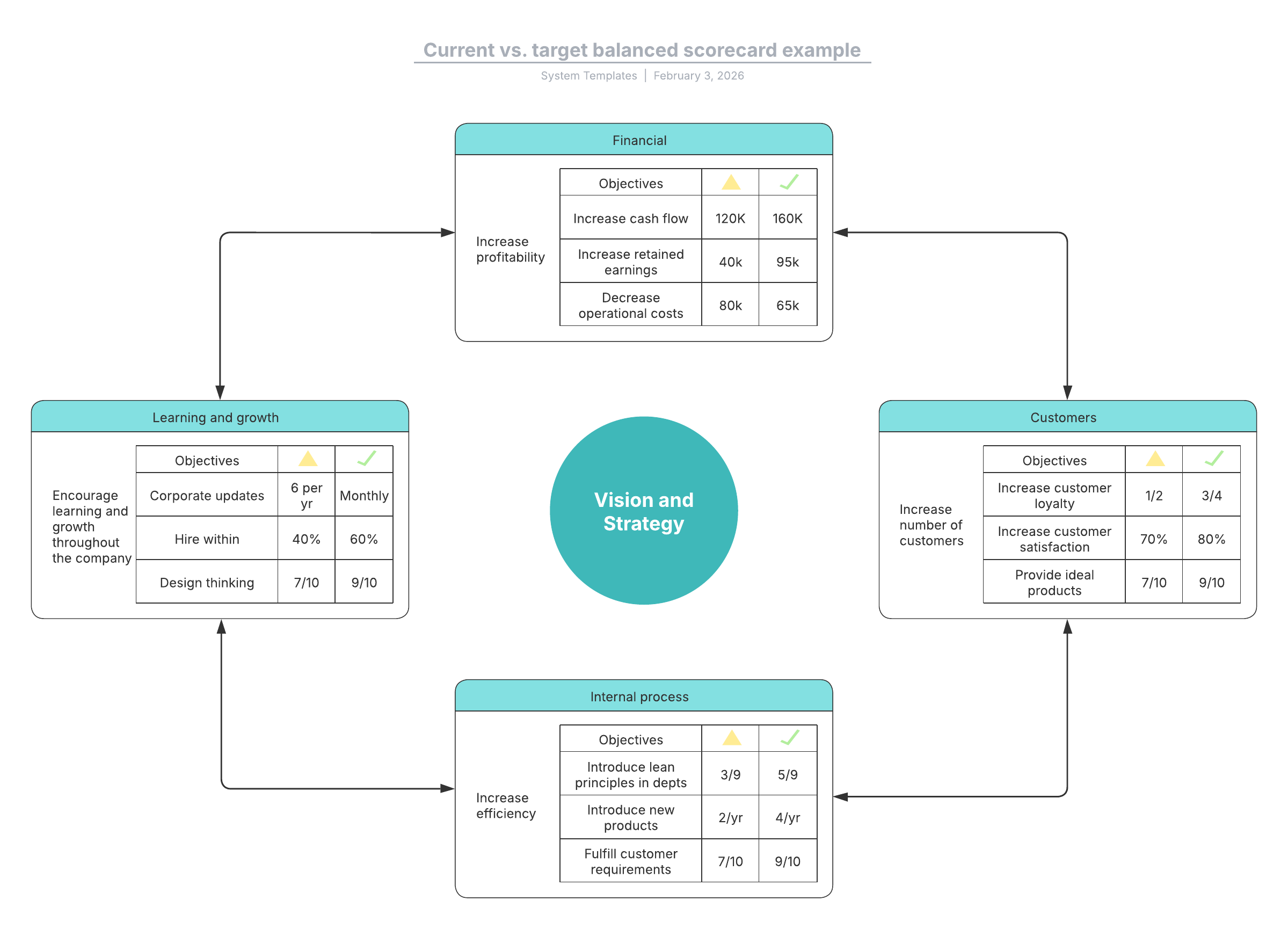 Open this template to view a detailed example of a current vs. target balanced scorecard diagram that you can customize to your use case.
