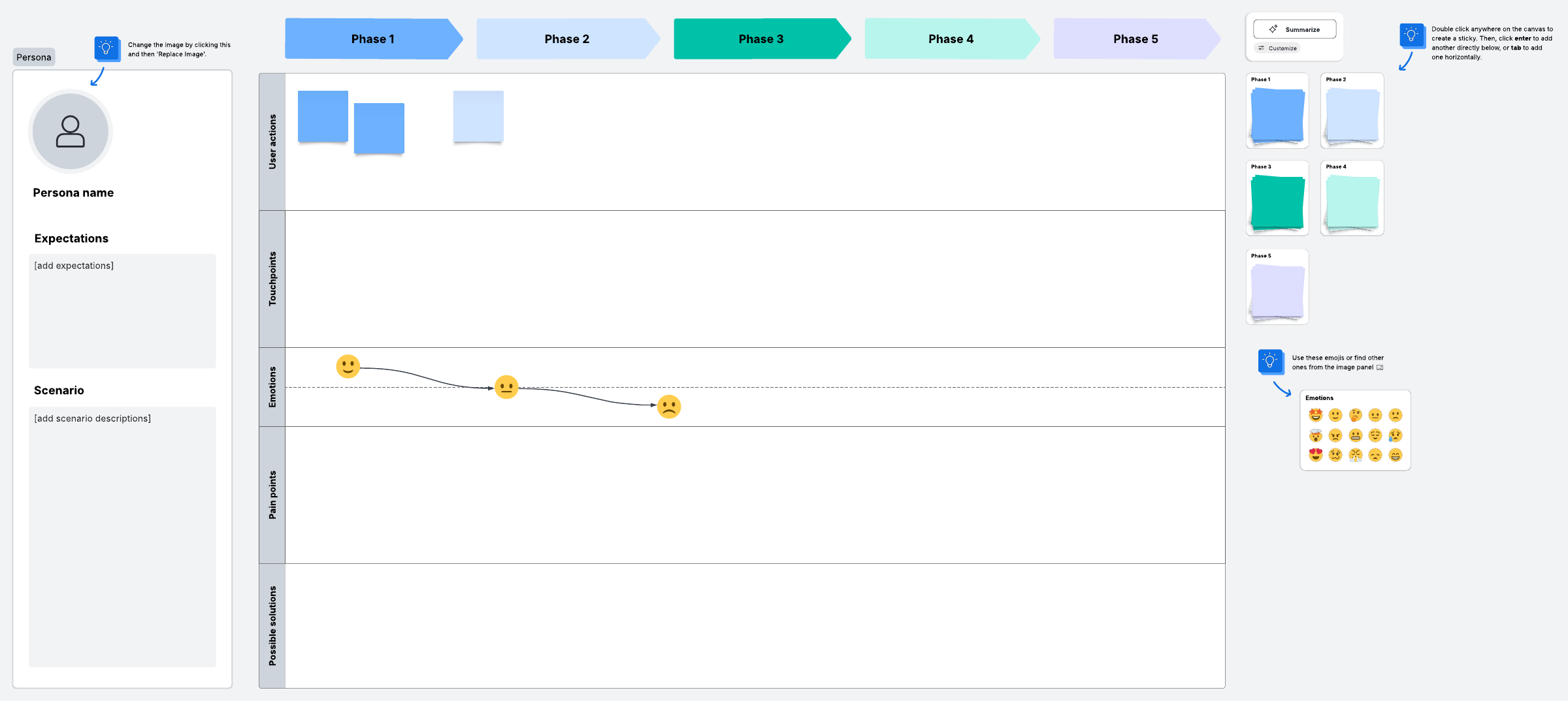 Once you’ve decided on your touchpoints, divide them into phases and add them to the columns in the template. Beneath the touchpoints, you can map how customers feel about the touchpoints and add any thoughts you have with sticky notes.