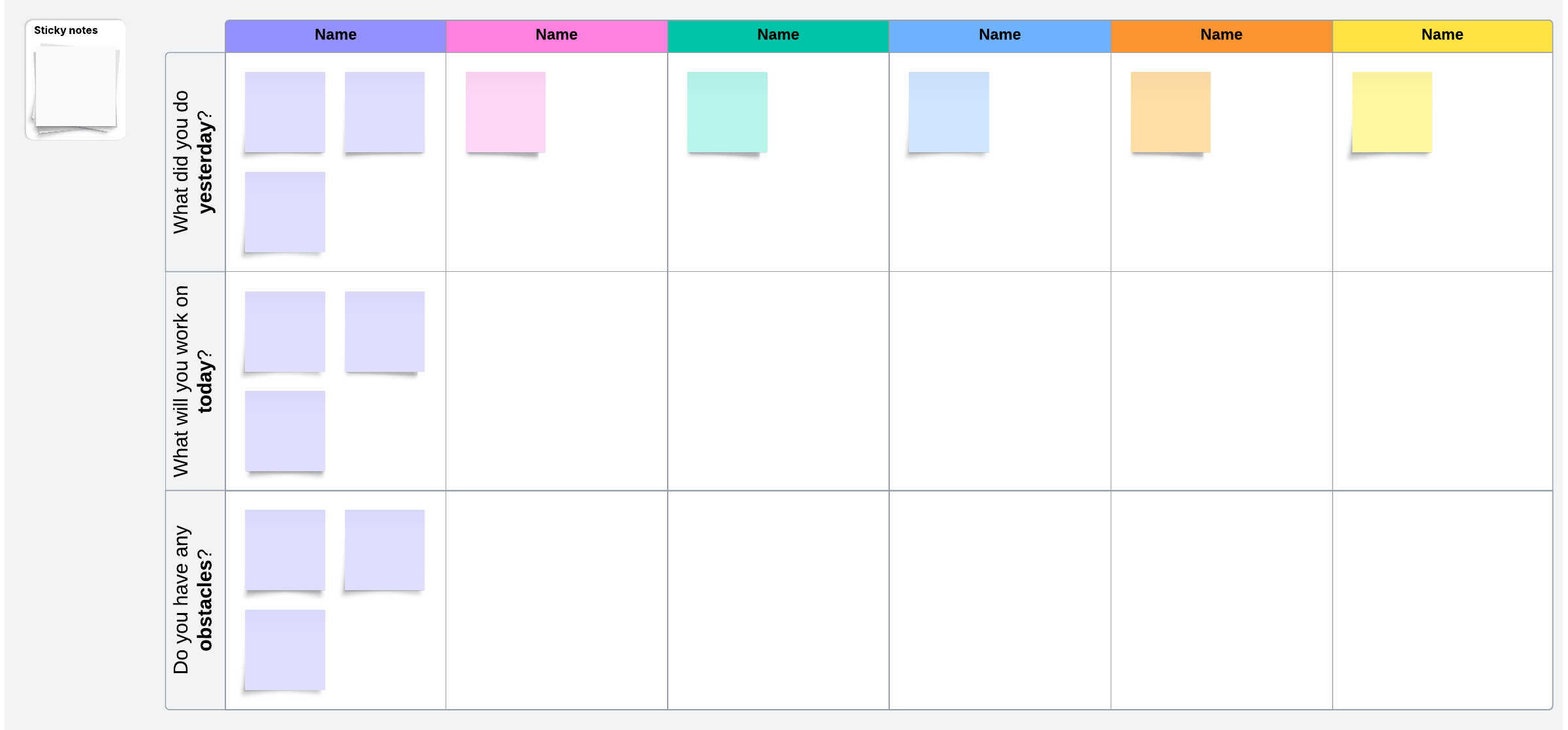- Encourage prep. Team members should be responsible for adding sticky notes that answer the three questions on the template. When it’s their turn, they can elaborate on those stickies. That way, there’s no pausing the standup to type.