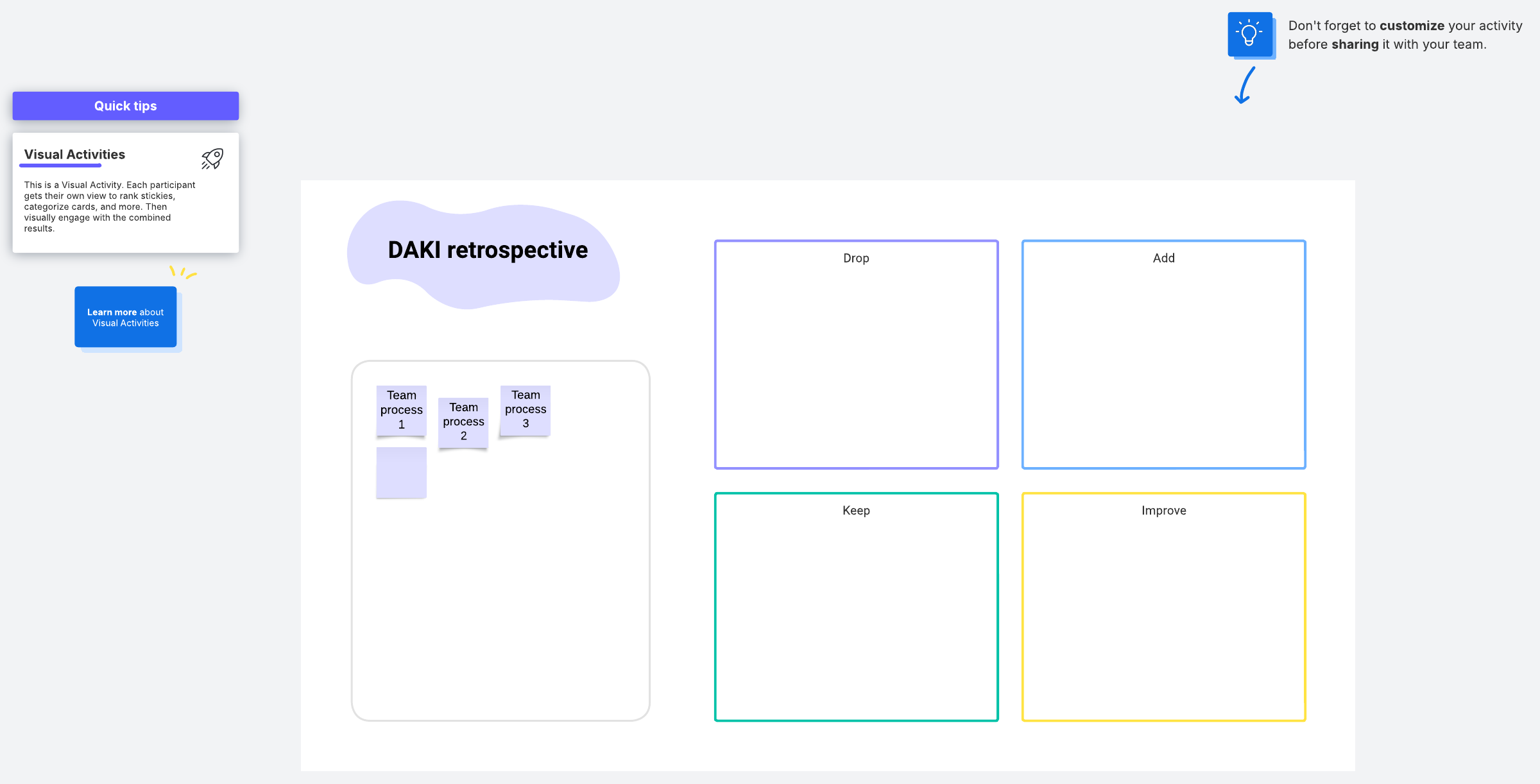 At the end of a project or agile sprint, use this retrospective activity to determine what actions to drop, add, keep, or improve (DAKI).