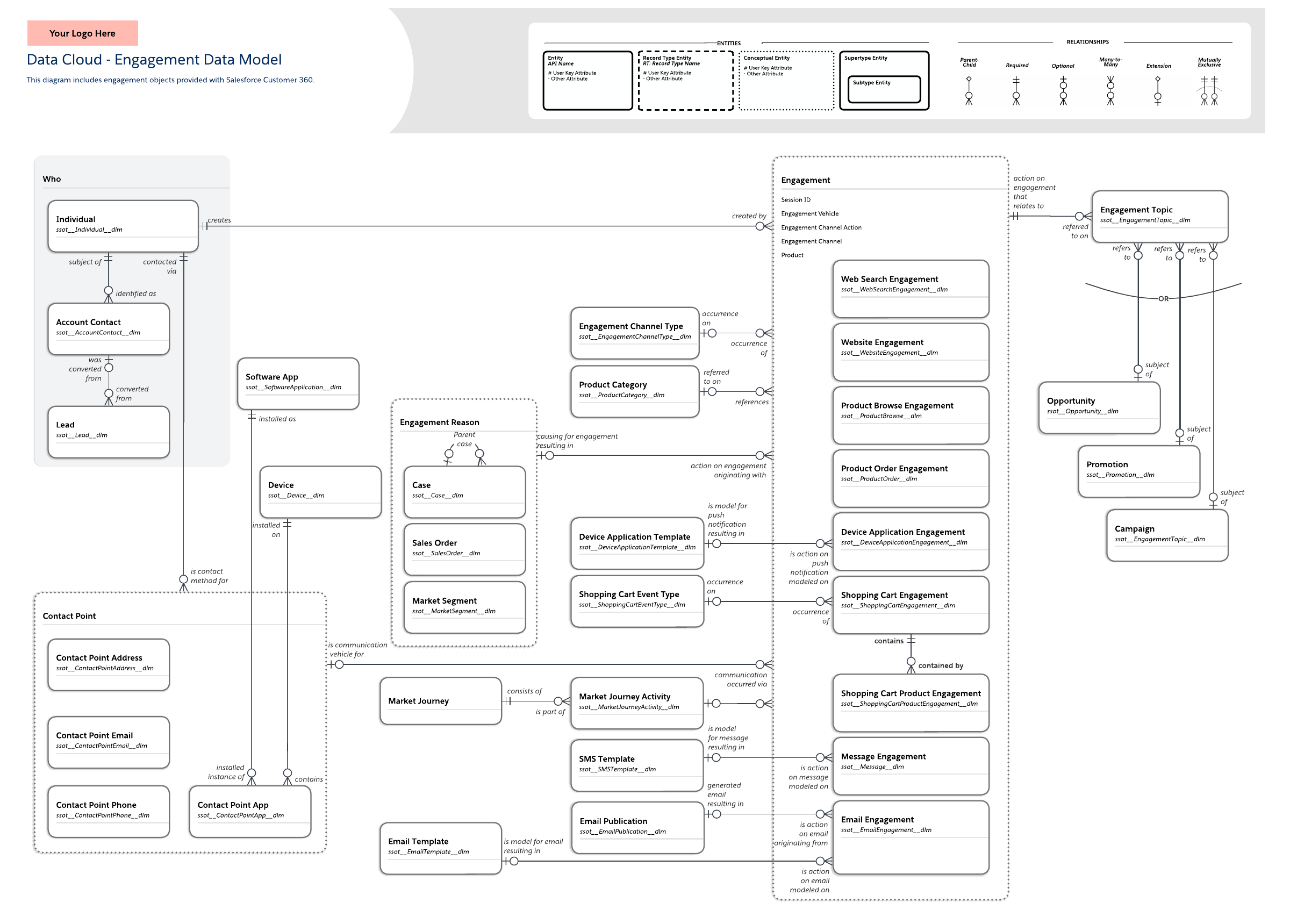 Open this template and add content to customize this Customer 360 engagement data model to your use case.