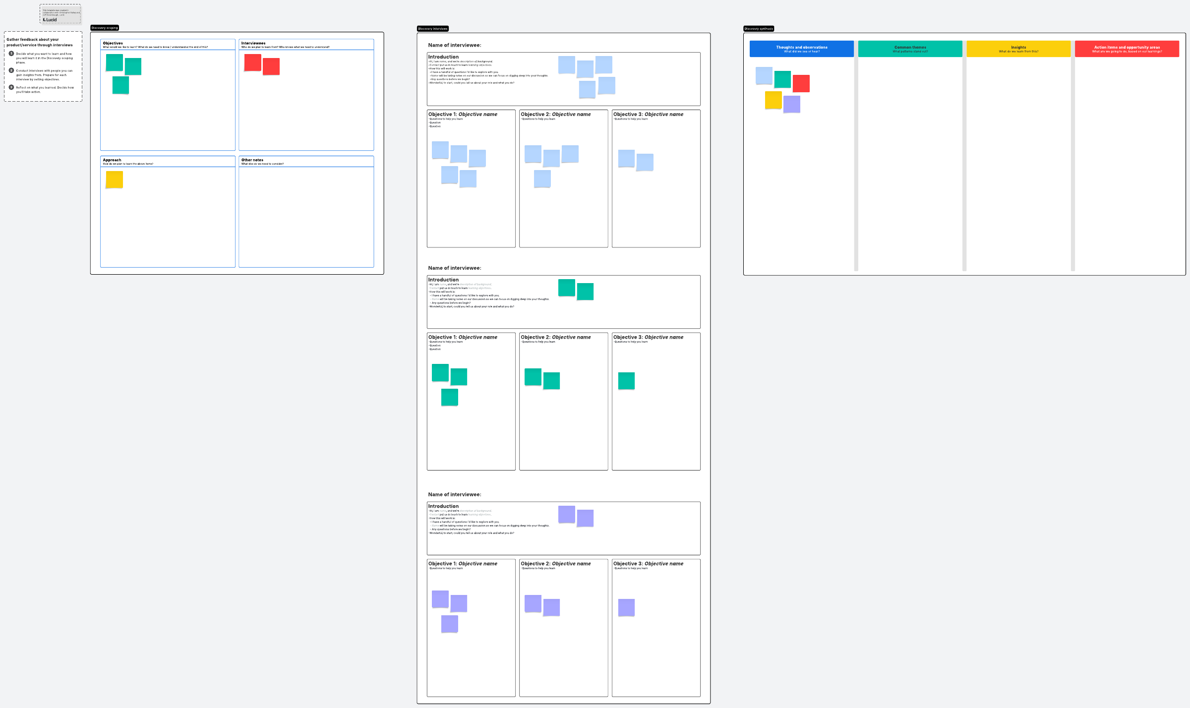The discovery board template offers a centralized location for all of the ideas and information you gain as you scope your discovery process, conduct your interviews, and synthesize your findings. Our template makes it easy to share each of your ideas amongst your team as you record notes, comments, and observations.
