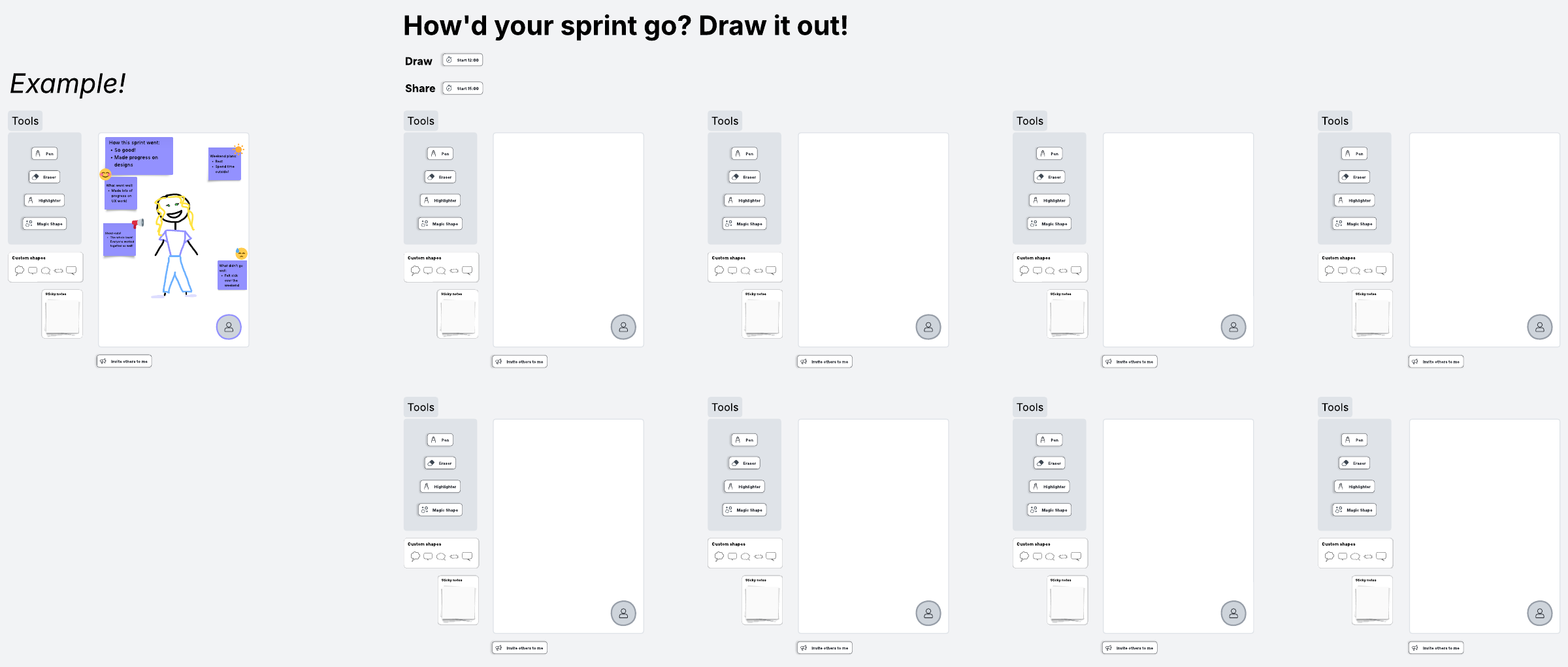 Draw a picture or symbol representing the sprint. Each person then presents their drawing to explain their perspective.