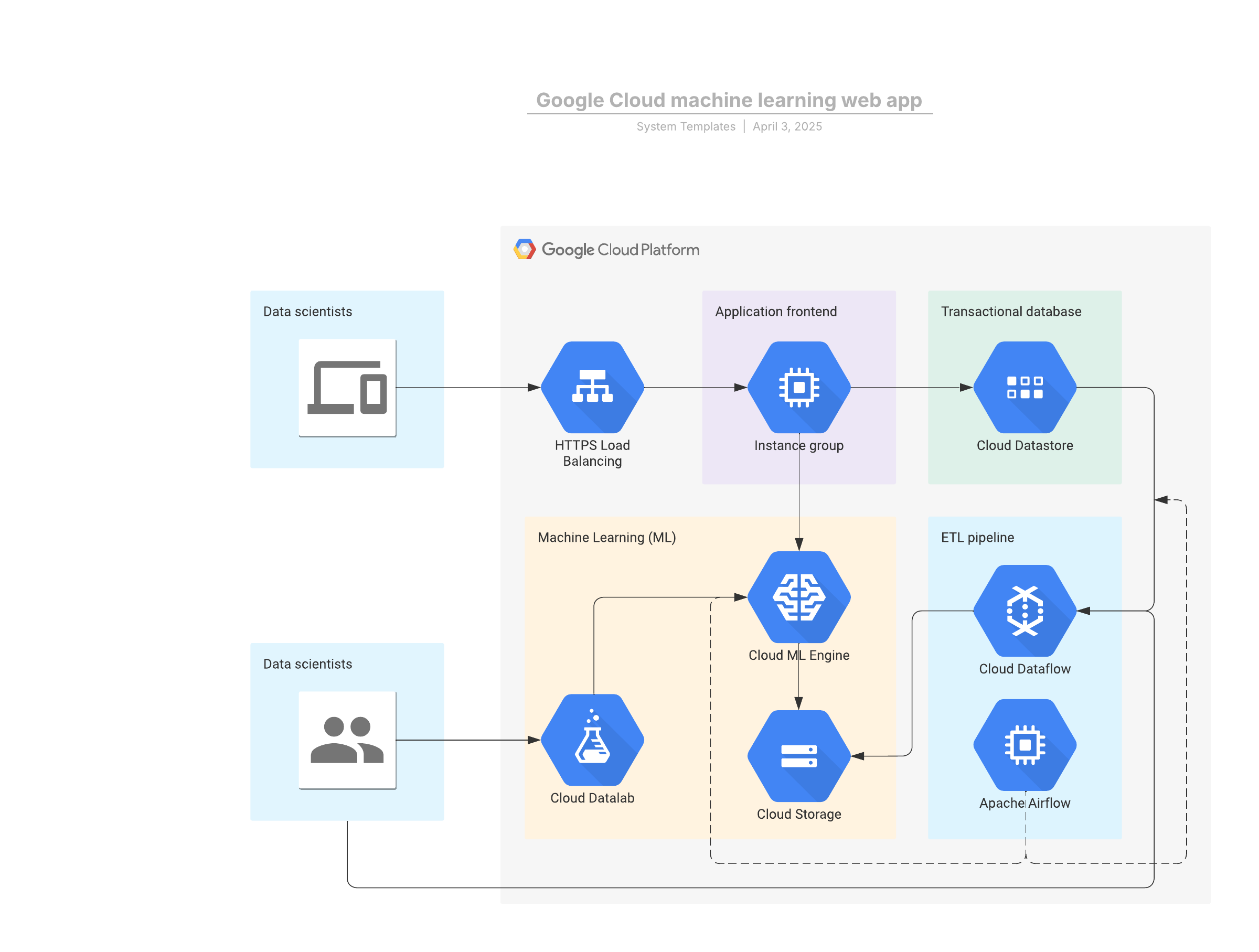 Open this template to view a Google Cloud machine learning web app reference architecture that you can customize to your use case.
