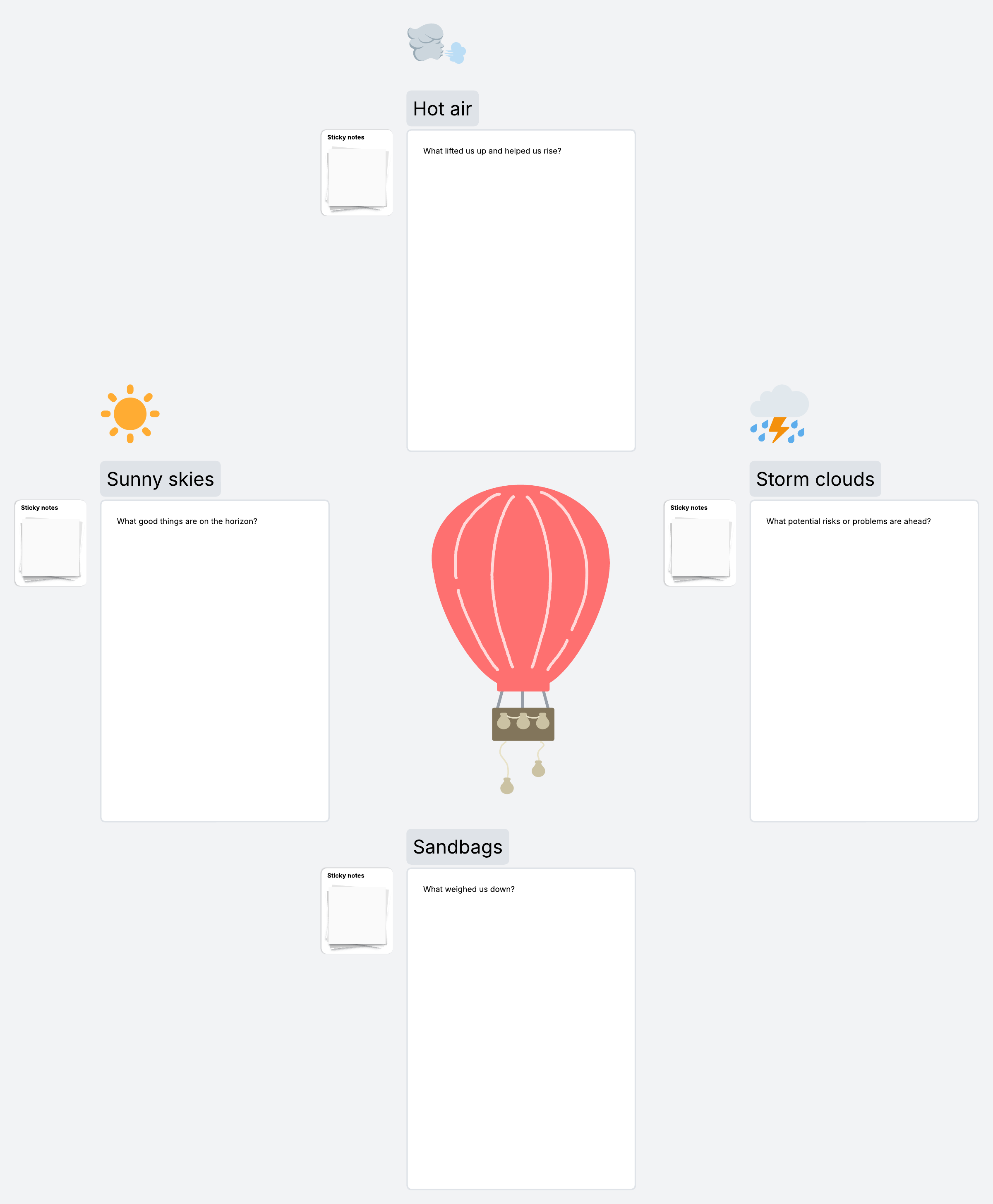 A visual metaphor to identify what lifts the team (hot air), what weighs it down (sandbags), and what's ahead.