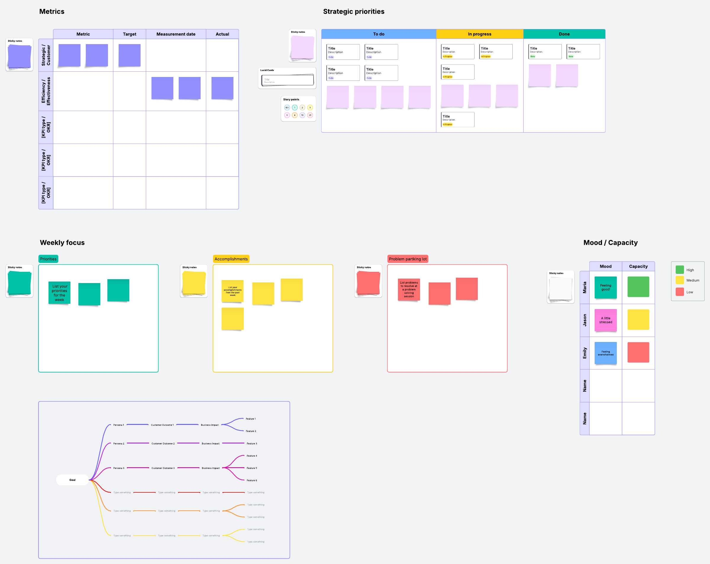 - Mood/capacity. Give your team members the chance to share where they’re at. In this section, record their mood and how ready or capable they feel about tackling their work.