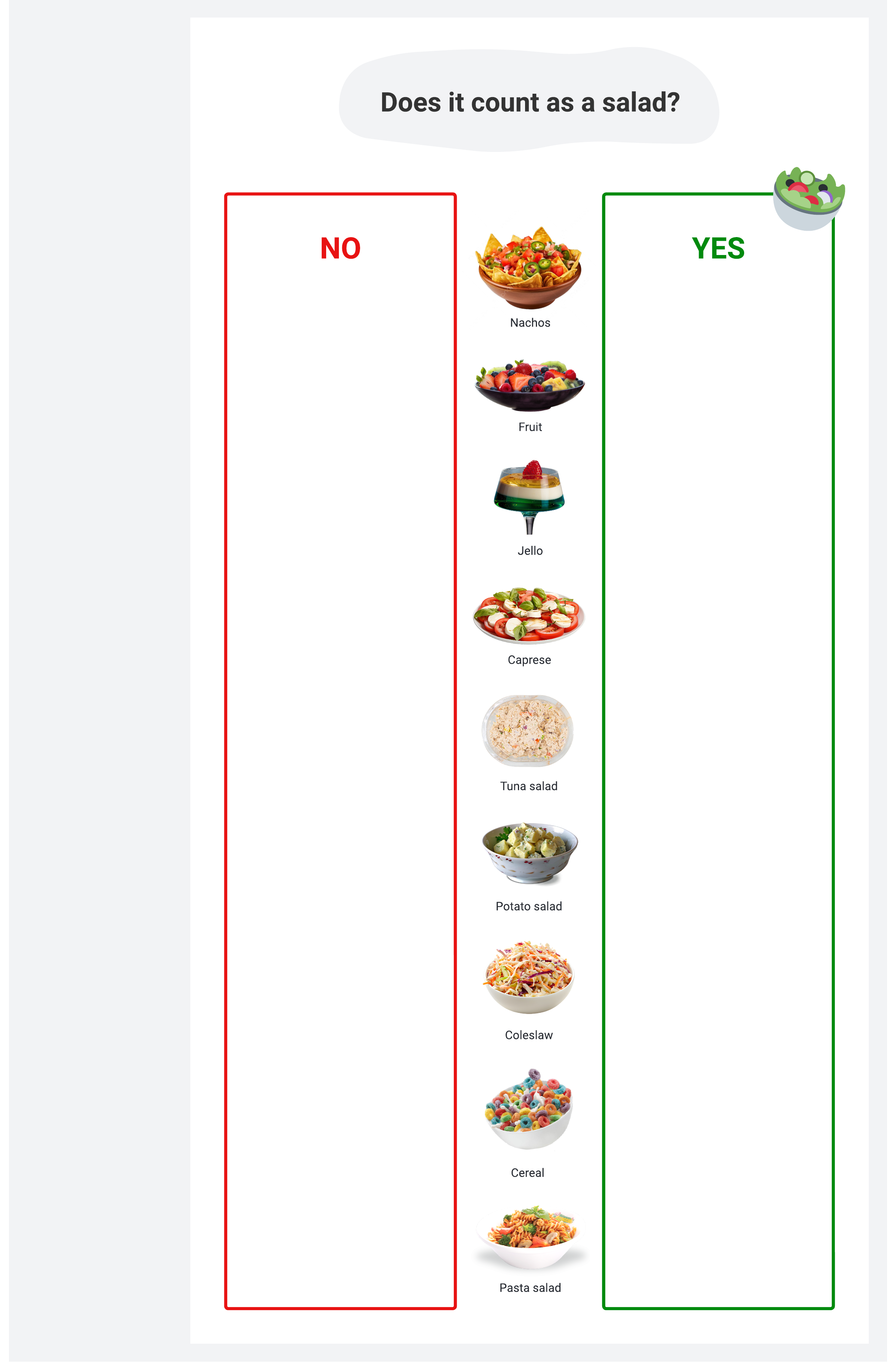 We all know leafy greens and dressing make a salad… or do they? In this drag-and-drop debate, decide what makes the cut. Is pasta salad really a salad? What about Jell-O with marshmallows? Drag each item into Yes or No and prepare for strong opinions and surprising realizations.