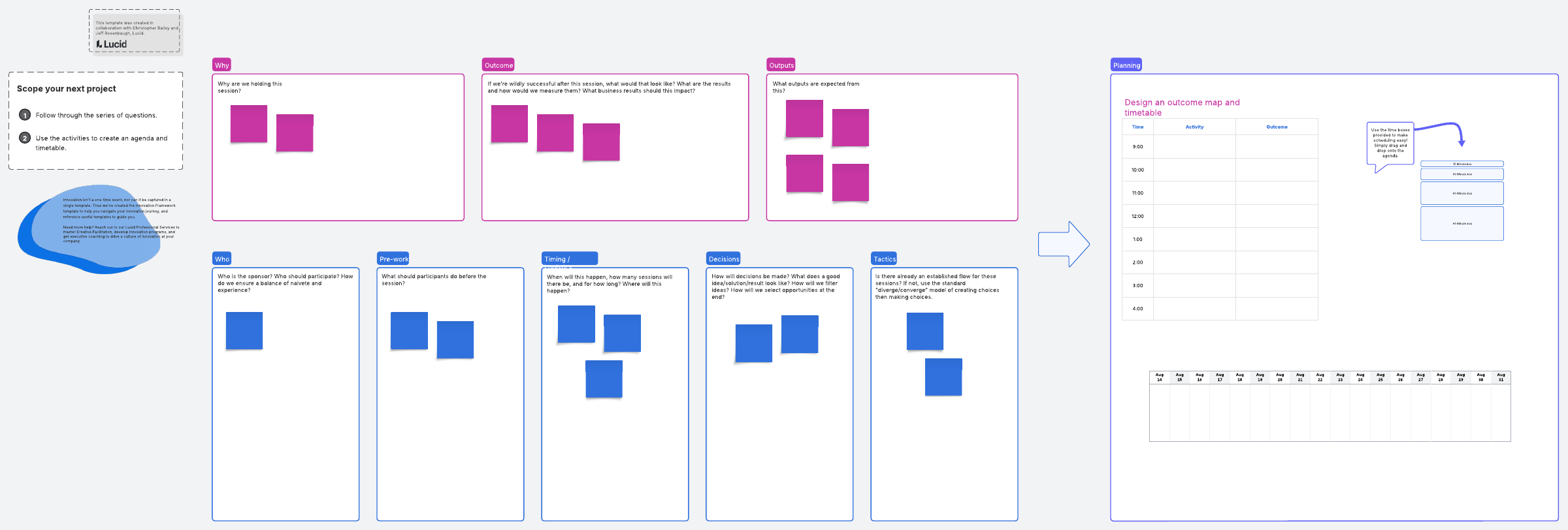 - How will decisions be made? What does a good idea/solution/result look like? How will we filter ideas? How will we select opportunities at the end?