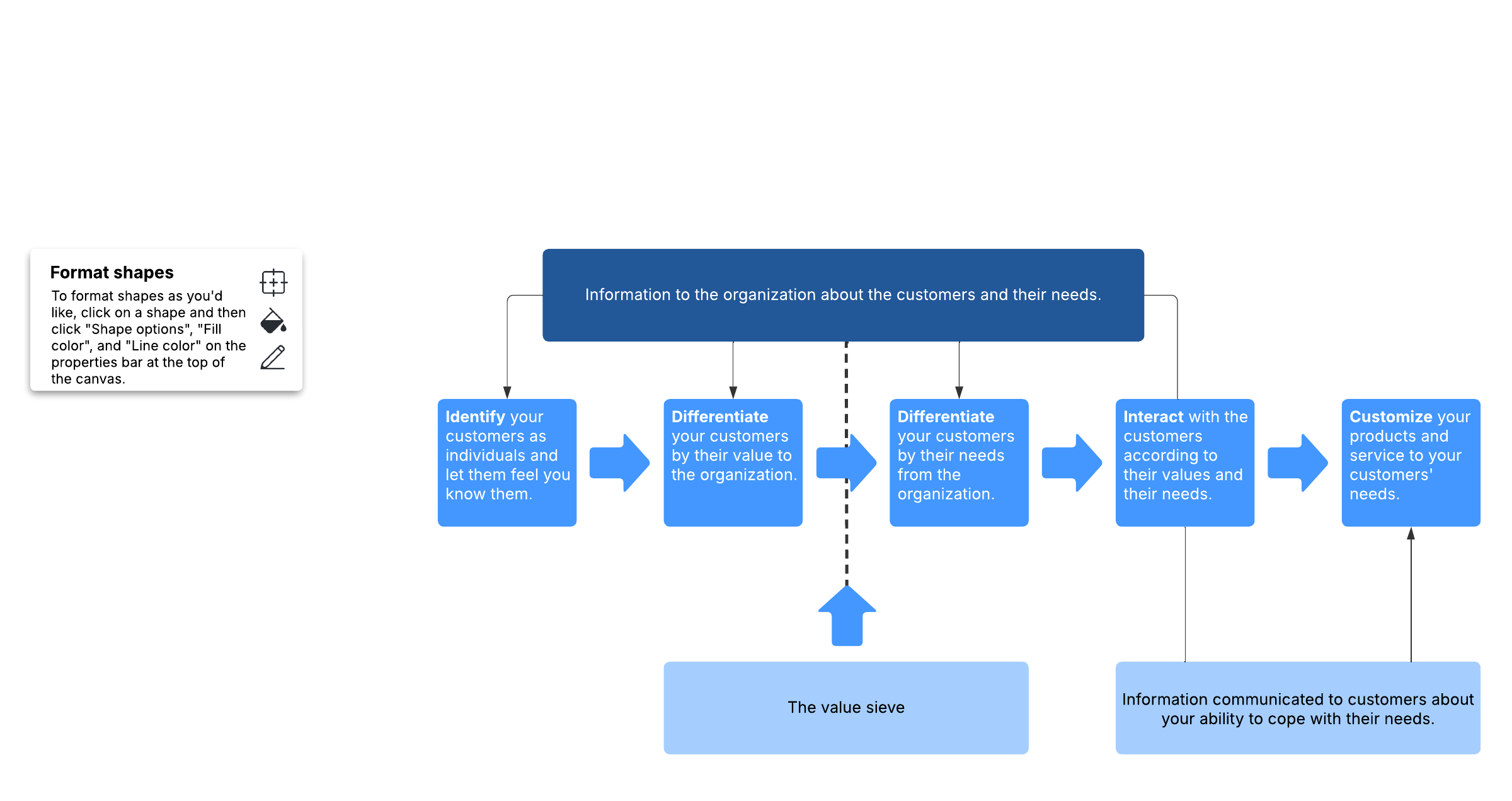 - Identify the actions you should take in order to build long-term one-to-one relationships with current and potential customers.
