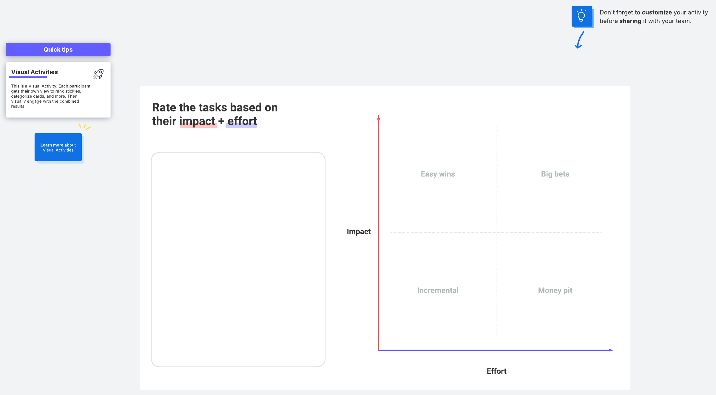 Help your team better plan your projects by understanding how initiatives or tasks rank relative to their potential impact and the effort it takes to complete them. This activity will help you identify what you should prioritize and why.