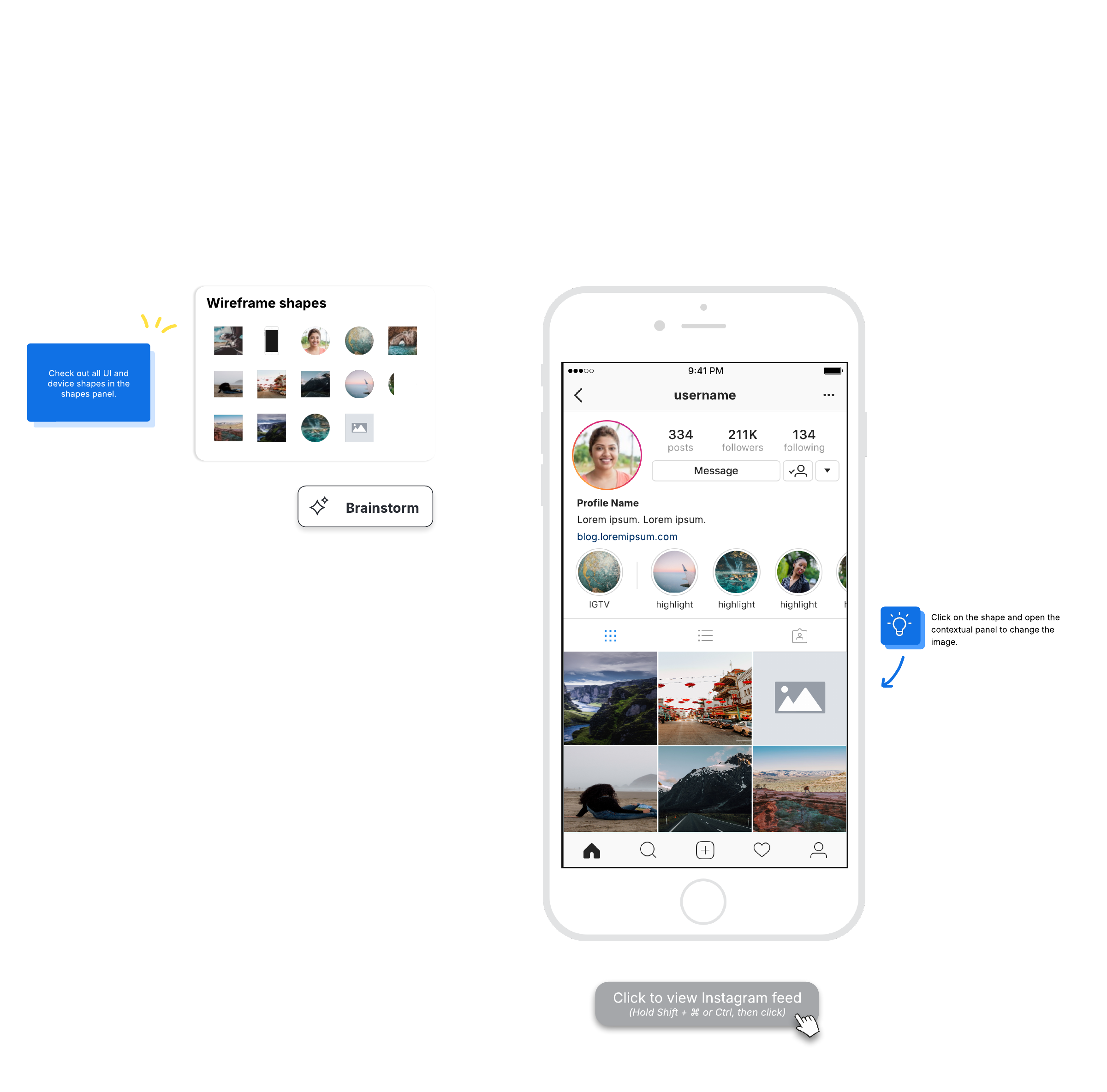 Open this template to view a detailed example of an Instagram wireframe that you can customize to your use case.