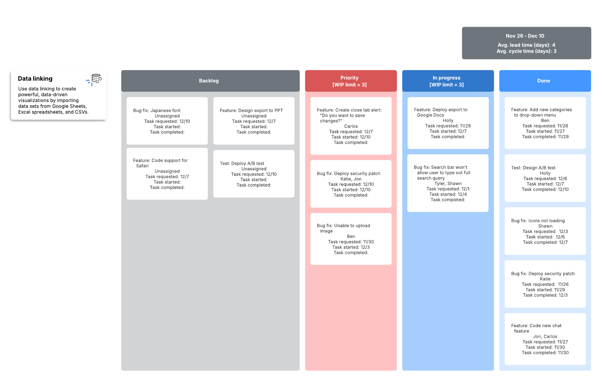Open this template to view a detailed example of a Kanban board with lead and cycle time that you can customize to your use case.