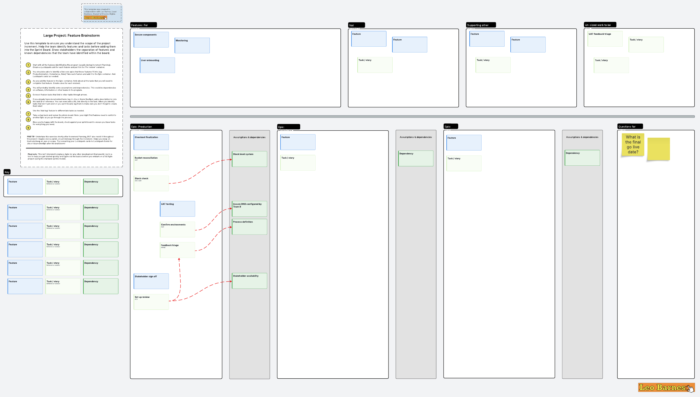 This template is used to help clarify and understand the scope of the program increment (PI). The large project feature brainstorm helps your team identify features and tasks before adding them into the sprint board. It can also show stakeholders the separation of features and known dependencies that the team has identified within the board.