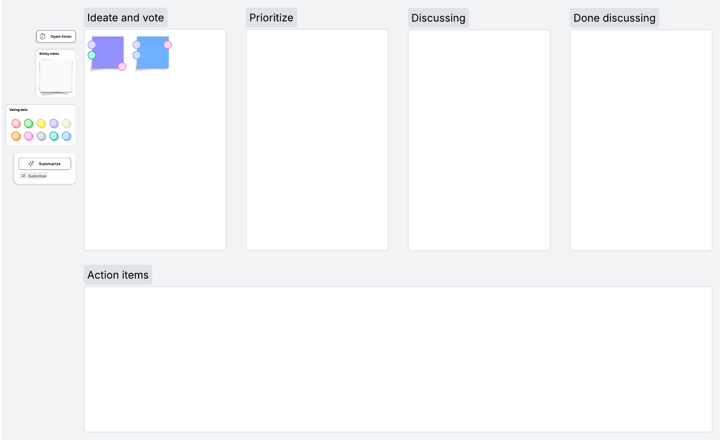 - Vote on topics. At the end of the brainstorm session, use the voting feature to vote on the topics that should be discussed during the retrospective. Move those stickies to the “To Discuss” container.