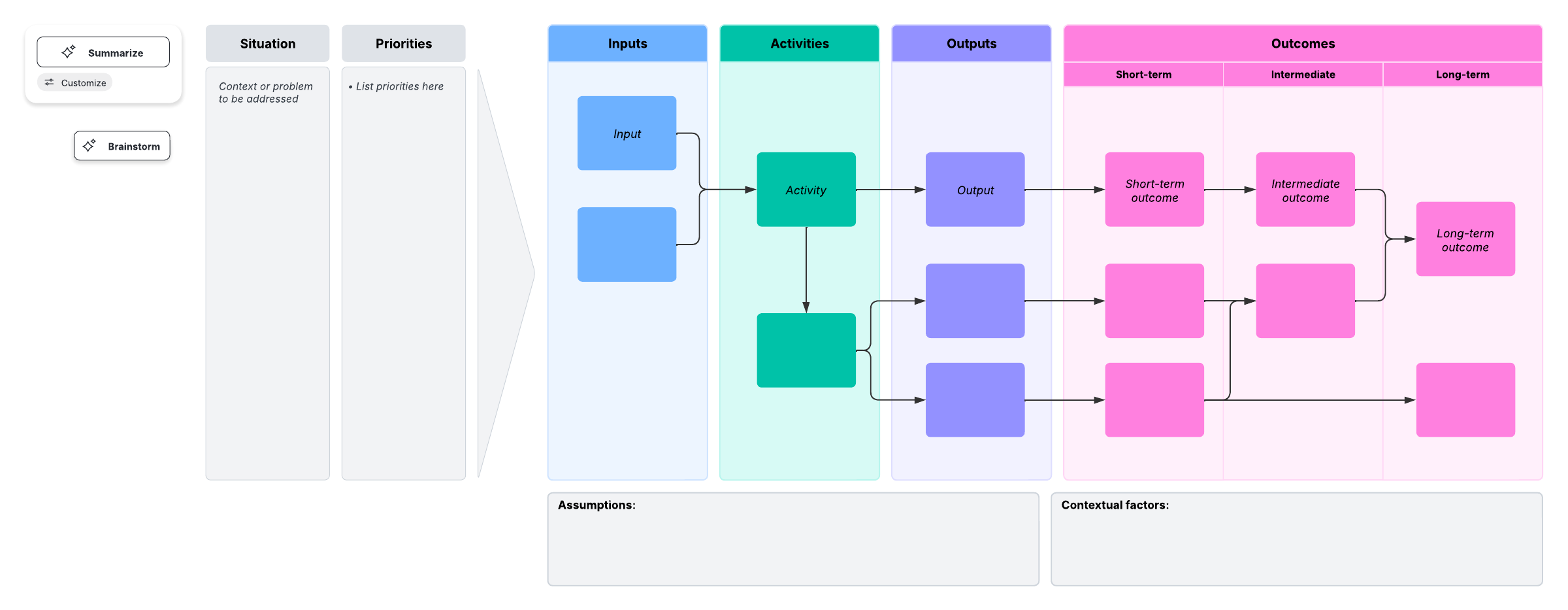 - Show potential inputs, activities, outputs, and outcomes of your process.
