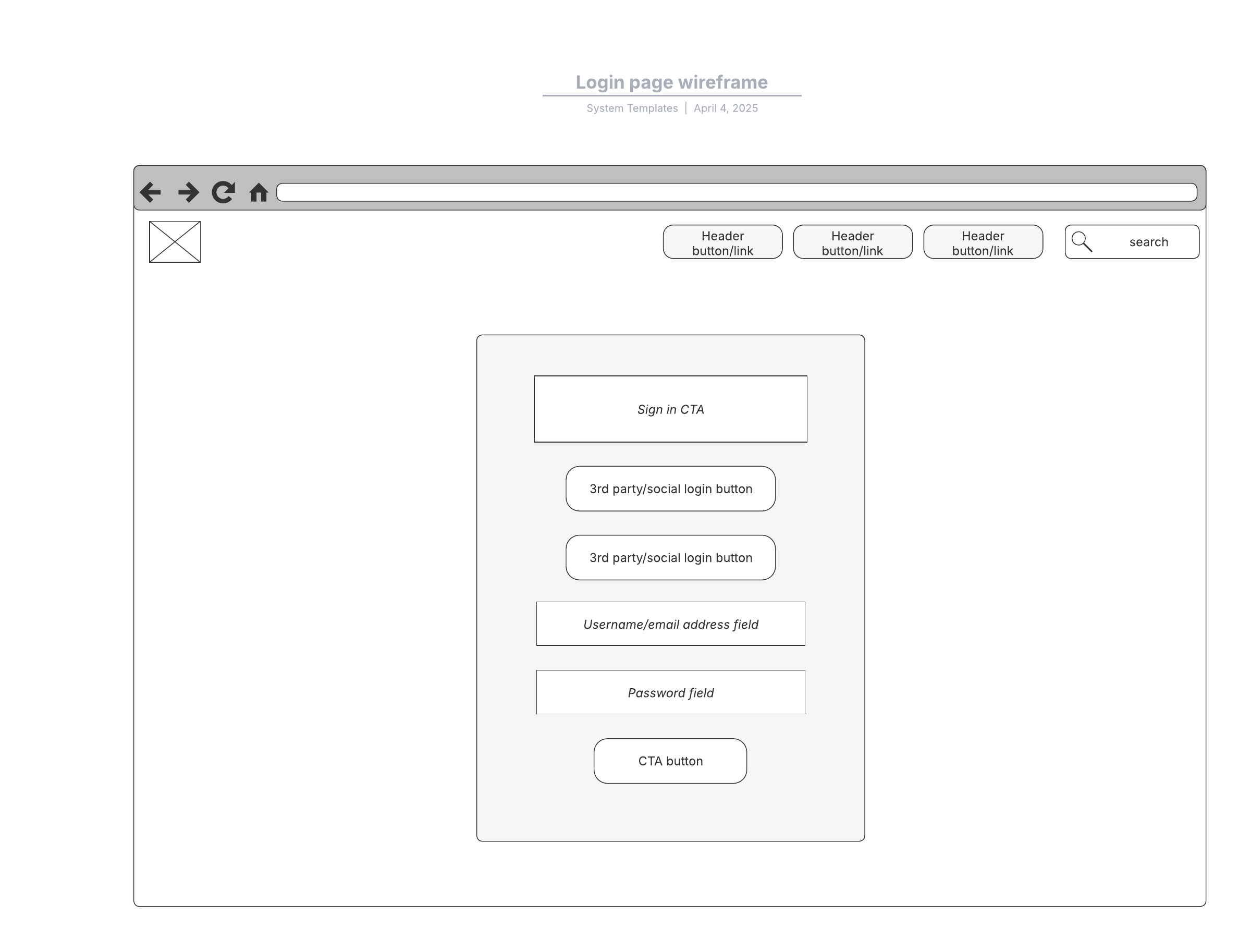 Open this template to view a detailed example of a login page basic wireframe that you can customize to your use case.