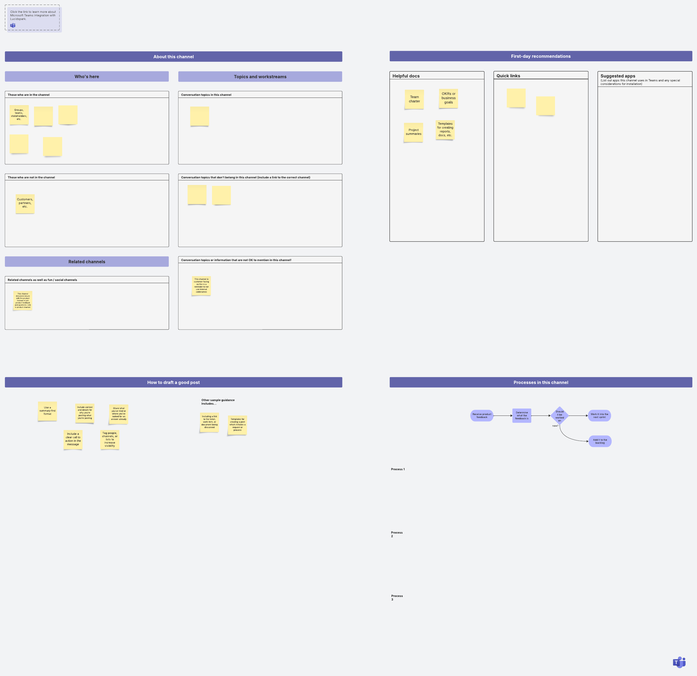 In Microsoft Teams, it's essential to understand the guidelines for each channel so you keep conversations productive and know what is—and what isn't—appropriate to add. This template, created with Microsoft Teams, helps you outline best practices for a channel, including channel details, first-day recommendations, tips for drafting a good post, and applicable processes. Add this board as a channel tab so everyone is always on the same page.