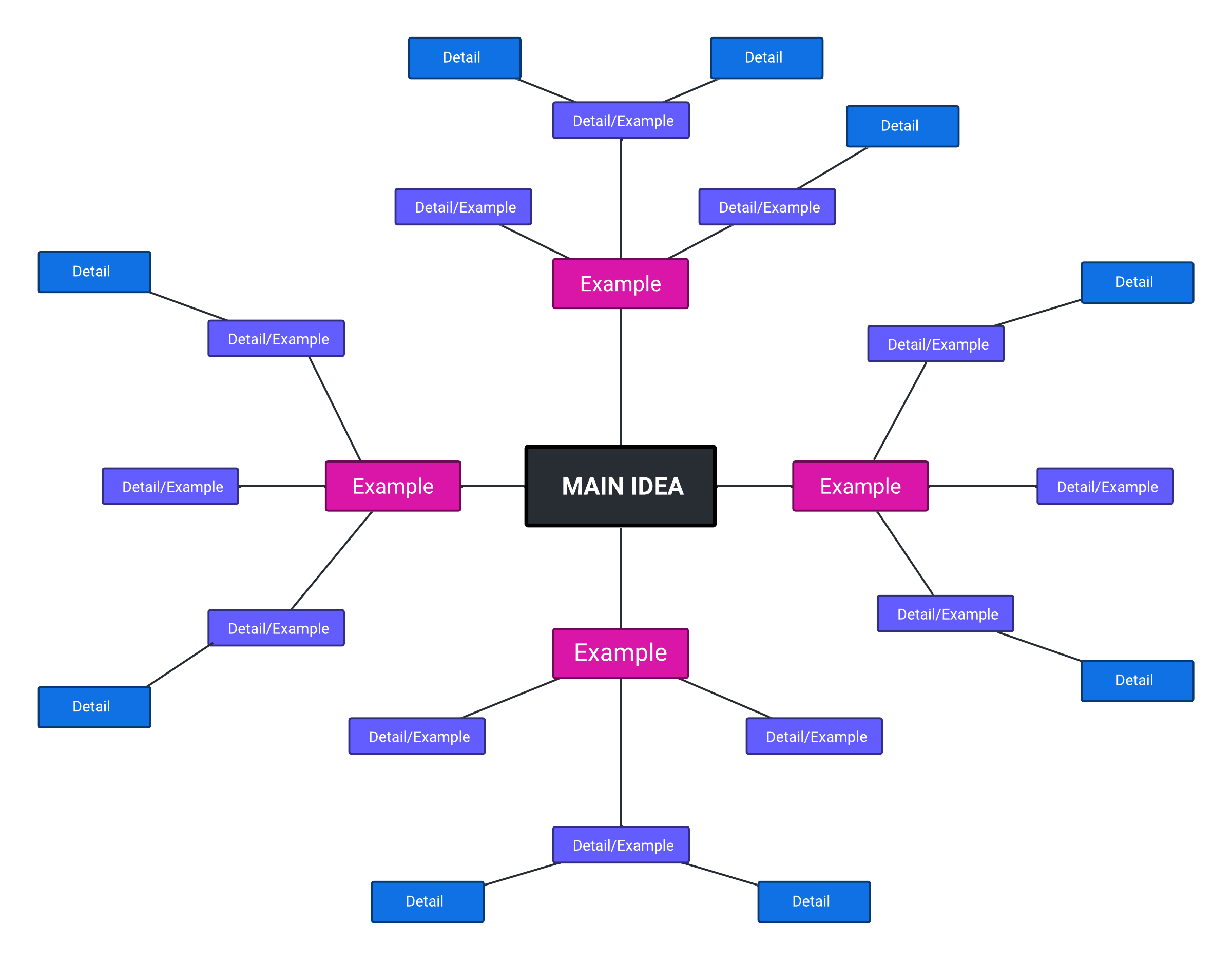 This idea mind map is excellent for organizing your thoughts. Map out your thoughts and ideas to bring clarity to your writing, project and more. This is a great mind mapping template for students or writers who need a visual representation of their ideas. Try the idea mind map template.